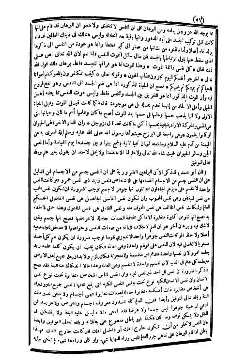 قَالَ أَبُو مُحَمَّد فلنذكر الْآن الْبَرَاهِين الضرورية على أَن النَّفس جسم من الْأَجْسَام فَمن الدَّلِيل على أَن النَّفس جسم من الْأَجْسَام انقسامها على الْأَشْخَاص فَنَفْس زيد غير نفس عَمْرو فَلَو كَانَت النَّفس وَاحِدَة لَا تَنْقَسِم على مَا يزْعم الجاهلون أَنَّهَا جَوْهَر لَا جسم لوَجَبَ ضَرُورَة أَن تكون نفس الْمُحب هِيَ نفس الْمُبْغض وَهِي نفس المحبوب وَأَن تكون نفس الْفَاسِق الْجَاهِل هِيَ نفس الْفَاضِل الْحَكِيم الْعَالم ولكانت نفس الْخَائِف هِيَ نفس الْمخوف مِنْهُ وَنَفس الْقَاتِل هِيَ نفس الْمَقْتُول وَهَذَا حمق لَا خَفَاء بِهِ فصح أَنَّهَا نفوس كَثِيرَة مُتَغَايِرَة الْأَمَاكِن مُخْتَلفَة الصِّفَات حاملة لأعراضها فصح أَنَّهَا جسم بِيَقِين لَا شكّ فِيهِ وبرهان آخر هُوَ أَن الْعلم لَا خلاف فِي أَنه من صِفَات النَّفس وخواصها لَا مدْخل للجسد فِيهِ أصلا ولاحظ فَلَو كَانَت النَّفس جوهرا وَاحِد لَا تتجزي نفوساً لوَجَبَ ضَرُورَة أَن يكون علم كل أحد مستوياً لَا تفاضل فِيهِ لِأَن النَّفس على قَوْلهم وَاحِدَة وَهِي العالمة فَكَانَ يجب أَن يكون كلما علمه زيد يُعلمهُ عَمْرو لِأَن نَفسهَا وَاحِدَة عِنْدهم غير منقسمة وَلَا متجزئة فَكَانَ يلْزم وَلَا بُد أَن يعلم جَمِيع أهل الأَرْض مَا يُعلمهُ كل عَالم فِي الدُّنْيَا لِأَن نفسهم وَاحِدَة لَا تَنْقَسِم وَهِي العالمة وَهَذَا مَالا انفكاك مِنْهُ الْبَتَّةَ فقد صَحَّ بِمَا ذكرنَا ضَرُورَة أَن نفس كل أحد غير نفس غَيره وَأَن أنفس النَّاس أشخاص مُتَغَايِرَة تَحت نوع نفس الْإِنْسَان وَإِن نفس الْإِنْسَان الْكُلية نوع تَحت جنس النَّفس الْكُلية الَّتِي يَقع تحتهَا أنفس جَمِيع الْحَيَوَان وَإِذ هِيَ أشخاص مُتَغَايِرَة ذَات أمكنة مُتَغَايِرَة حاملة لصفات مُتَغَايِرَة فَهِيَ أجسام وَلَا يُمكن غير ذَلِك الْبَتَّةَ وَبِاللَّهِ تَعَالَى التَّوْفِيق وَأَيْضًا فَإِن الْعَالم كُله مَحْدُود مَعْرُوف أجسام وأعراض وَلَا مزِيد فَمن ادّعى أَن هَهُنَا جوهراً لَيْسَ جسماً وَلَا عرضا فقد ادّعى مَا لَا دَلِيل عَلَيْهِ الْبَتَّةَ وَلَا يتشكل فِي الْعقل وَلَا يُمكن توهمه وَمَا كَانَ هَكَذَا فَهُوَ بَاطِل مَقْطُوع على بُطْلَانه وَبِاللَّهِ تَعَالَى التَّوْفِيق وَأَيْضًا فَإِن النَّفس لَا تَخْلُو من أَن تكون خَارج الْفلك أَو دَاخل الْفلك فَإِن كَانَت خَارج الْفلك فَهَذَا بَاطِل إِذا قَامَ الْبُرْهَان على تناهي جرم الْعَالم فَلَيْسَ وَرَاء النِّهَايَة شَيْء وَلَو كَانَ وَرَاءَهَا شَيْء لم تكن نِهَايَة