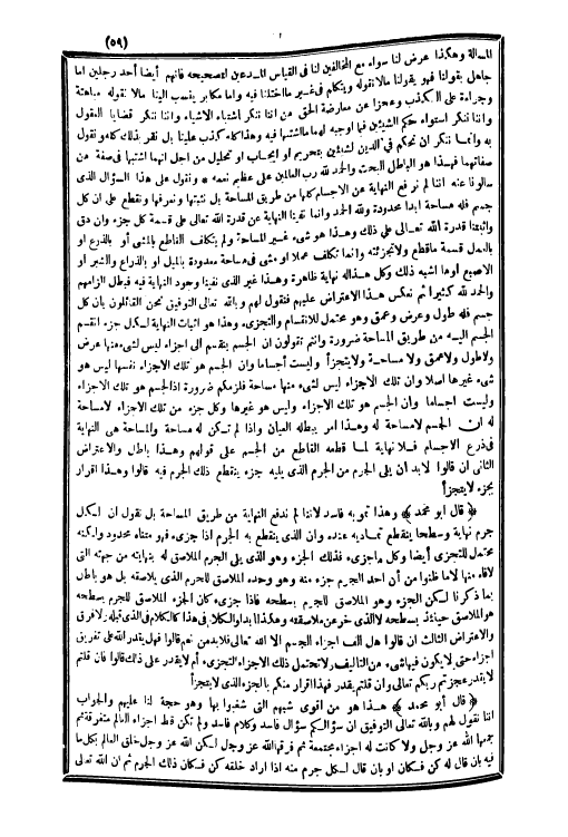 قَالَ أَبُو مُحَمَّد وَهَذَا تمويه فَاسد لأننا لم ندفع النِّهَايَة من طَرِيق المساحة بل نقُول إِن لكل جرم نِهَايَة وسطحاً يَنْقَطِع تماديه عِنْده وَإِن الَّذِي يَنْقَطِع بِهِ الجرم إِذا جزئ فَهُوَ متناه مَحْدُود وَلكنه مُحْتَمل للتجزيء أَيْضا وكل مَا جزئ فَذَلِك الْجُزْء وَهُوَ الَّذِي يَلِي الجرم الملاصق لَهُ بنهايته من جِهَته الَّتِي لاقاه مِنْهَا لَا مَا ظنُّوا من أَن أحد الجرم جُزْء مِنْهُ وَهُوَ وَحده الملاصق للحرم الَّذِي يلاصقه بل هُوَ بَاطِل بِمَا ذكرنَا لَكِن الْجُزْء وَهُوَ الملاصق للجرم بسطحه فَإِذا جزئ كَانَ الْجُزْء الملاصق للجرم بسطحه هُوَ الملاصق حِينَئِذٍ بسطحه لَا الَّذِي خر عَن ملاصقته وَهَكَذَا بدا وَالْكَلَام فِي هَذَا كَالْكَلَامِ فِي الَّذِي قبله وَلَا فرق والاعتراض الثَّالِث إِن قَالُوا هَل ألف أَجزَاء الْجِسْم إِلَّا الله تَعَالَى فَلَا بُد من نعم قَالُوا فَهَل بِقدر الله على تَفْرِيق أَجزَاء حَتَّى لَا يكون فِيهَا شَيْء من التَّأْلِيف وَلَا تحْتَمل ذَلِك الْأَجْزَاء التجزيء أم لَا يقدر على ذَلِك قَالُوا فَإِن قُلْتُمْ لَا يقدر عجزتم ربكُم تَعَالَى وَإِن قُلْتُمْ يقدر فَهَذَا إِقْرَار مِنْكُم بالجزء الَّذِي لَا يتَجَزَّأ