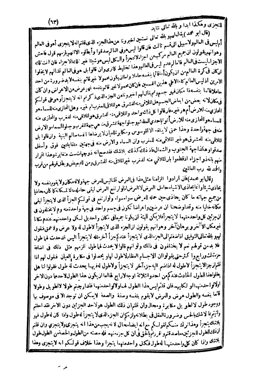 قَالَ أَبُو مُحَمَّد يُقَال لَهُم وَبِاللَّهِ تَعَالَى نستعين أخبرونا عَن هَذَا الْجُزْء الَّذِي قُلْتُمْ أَنه لَا يتحزى أهوَ فِي الْعَالم أم لَيْسَ فِي الْعَالم وَلَا سَبِيل إِلَى قسم ثَالِث فَإِن قَالُوا لَيْسَ هُوَ فِي الْعَالم صدقُوا وأبطلوا إِلَّا أَنهم يلْزمهُم قَول فَاحش وَهُوَ أَنهم يَقُولُونَ أَن جَمِيع الْعَالم مركب من أَجزَاء لَا تتجزأ وَالْكل لَيْسَ هُوَ شَيْئا غير تِلْكَ الْأَجْزَاء فَإِن كَانَت تِلْكَ الْأَجْزَاء لَيست فِي الْعَالم فالعالم عدم لَيْسَ فِي الْعَالم وَهَذَا تَخْلِيط كَمَا ترى وَإِن قَالُوا بل هُوَ فِي الْعَالم قُلْنَا لَهُم لَا يَخْلُو إِن فِي كل كرة الْعَالم من أَن يكون إِمَّا قَائِما بِنَفسِهِ حَامِلا وَإِمَّا أَن يكون مَحْمُولا غير قَائِم بِنَفسِهِ لَا بُد ضَرُورَة من أحد الْأَمريْنِ إِذْ لَيْسَ الْعَالم كُله إِلَّا على هذَيْن الْقسمَيْنِ فَإِن كَانَ مَحْمُولا غير قَائِم بِنَفسِهِ فَهُوَ عرض من الْأَعْرَاض وَإِن كَانَ حَامِلا قَائِما بِنَفسِهِ ذَا مَكَان فَهُوَ جسم وَثمّ يُقَال لَهُم أخبرونا عَن الْجُزْء الَّذِي ذكرْتُمْ أَنه لَا يتَجَزَّأ وَهُوَ على قَوْلكُم فِي مَكَان لِأَنَّهُ بعض من أبعاض الْجِسْم هَل الملاقي مِنْهُ للمشرق هُوَ الملاقي للمغرب أم غَيره وَهل المحازي مِنْهُ للسماء هُوَ المحازى مِنْهُ للْأَرْض أم غَيره فَإِن قَالُوا كل ذَلِك وَاحِد والملاقي مِنْهُ للمشرق هُوَ الملاقي مِنْهُ للمغرب والمجازى مِنْهُ للسماء هُوَ المجازى مِنْهُ للْأَرْض أَتَوا بِإِحْدَى العظائم وَجعلُوا جِهَة الْمشرق منا هِيَ جِهَة الْمغرب وَجعلُوا السَّمَاء وَالْأَرْض مِنْهُ فِي جِهَة وَاحِدَة وَهَذَا حمق لَا يبلغهُ إِلَّا الموسوس ومكابرة للعيان لَا يرضاها لنَفسِهِ سَالم البنية وَإِن قَالُوا بل الملاقي مِنْهُ للمشرق هُوَ غير الملاقي مِنْهُ للمغرب وَأَن السَّمَاء وَالْأَرْض مِنْهُ فِي جِهَتَيْنِ متقابلتين فَوق وأسفل صدقُوا وَهَكَذَا جِهَة الْجنُوب وَالشمَال فَإذْ ذَلِك كَذَلِك بِلَا شكّ فقد صَحَّ أَنه ذُو جِهَات سِتّ مُتَغَايِرَة وَهَذَا إِقْرَار مِنْهُم بِأَنَّهُ ذُو أَجزَاء إِذْ قطعُوا بِأَن الملاقي مِنْهُ للمغرب غير الملاقي مِنْهُ للمشرق وَمن للتَّبْعِيض وَبَطل قَوْلهم من قرب وَالْحَمْد لله رب الْعَالمين