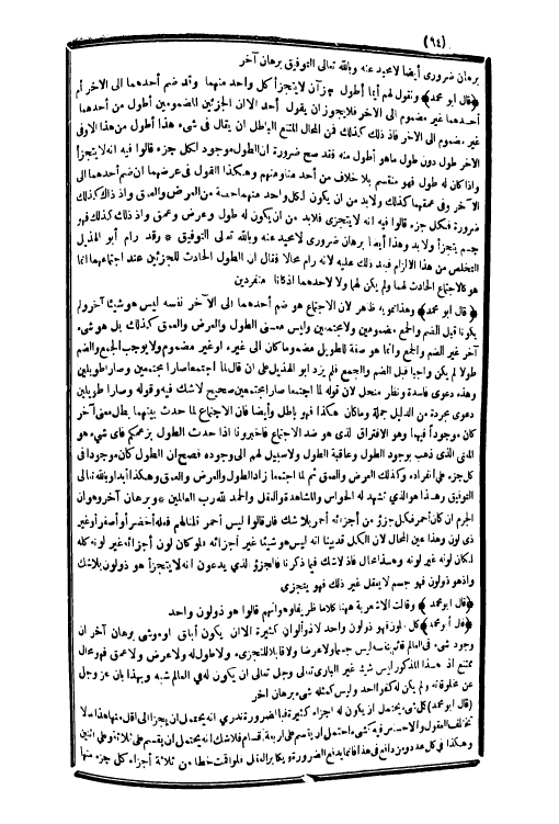 قَالَ أَبُو مُحَمَّد ونقول لَهُم أَيّمَا أطول جزآن لَا يتَجَزَّأ كل وَاحِد مِنْهُمَا وَقد ضم أَحدهمَا إِلَى الآخر أم أَحدهمَا غير مضموم إِلَى الآخر فَلَا يجوز أَن يَقُول لأحد إِلَّا أَن الجزئين المضمومين أطول من أَحدهمَا غير مضموم إِلَى الآخر فَإذْ ذَلِك كَذَلِك فَمن الْمحَال المتنع الْبَاطِل أَن يُقَال فِي شَيْء هَذَا أطول من هَذَا إِلَّا وَفِي الآخر طول دون طول مَا هُوَ أطول مِنْهُ فقد صَحَّ ضَرُورَة أَن الطول مَوْجُود لكل جُزْء قَالُوا فِيهِ أَنه لَا يتَجَزَّأ وَإِذا كَانَ لَهُ طول فَهُوَ منقسم بِلَا خلاف من أحد منا وَمِنْهُم وَهَكَذَا القَوْل فِي عرضهما أَن ضم أَحدهمَا إِلَى الآخر وَفِي عمقها كَذَلِك وَلَا بُد من أَن يكون لكل وَاحِد مِنْهُمَا حِصَّة من الْعرض والعمق وَإِذ ذَاك كَذَلِك ضَرُورَة فَكل جُزْء قَالُوا فِيهِ أَنه لَا يتجزى فَلَا بُد من أَن يكون لَهُ طول وَعرض وعمق وَإِذ ذَلِك كَذَلِك ضَرُورَة فَكل جُزْء قَالُوا فِيهِ أَنه لَا يتَجَزَّأ فَلَا بُد من ان يكون لَهُ طول وَعرض وعمق وَإِذ ذَلِك كَذَلِك فَهُوَ جسم يتَجَزَّأ وَلَا بُد وَهَذَا أَيْضا برهَان ضَرُورِيّ لَا محيد عَنهُ وَبِاللَّهِ تَعَالَى التَّوْفِيق