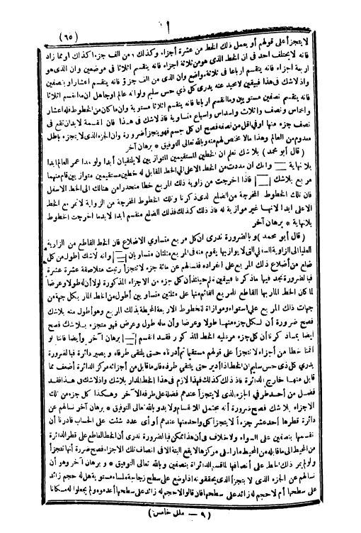 قَالَ أَبُو مُحَمَّد بِلَا شكّ نعلم أَن الخطين المستقيمين المتوازيين لَا يَلْتَقِيَانِ أبدا وَلَو مدا عمر الْعَالم أبدا بِلَا نِهَايَة وَأَنَّك إِن مددت من الْخط الْأَعْلَى إِلَى الْخط الْمُقَابل لَهُ خطين مستقيمين متوازيين قَالَ مِنْهُمَا مربع بِلَا الشَّك فَإذْ أخرجت من زَاوِيَة ذَلِك المربع خطا منحدراً من هُنَالك إِلَى الْخط الْأَسْفَل فَإِن تِلْكَ الخطوط المخرجة من الضلع لَدَى ذكرنَا وَتلك الخطوط المخرجة من الزاوية لَا تمر مَعَ الْخط الْأَعْلَى أبدا لِأَنَّهَا غير موازية لَهُ فَإذْ ذَلِك كَذَلِك فَذَلِك الضلع منقسم أبدا لَا بُد مَا أخرجت الخطوط بِلَا نِهَايَة