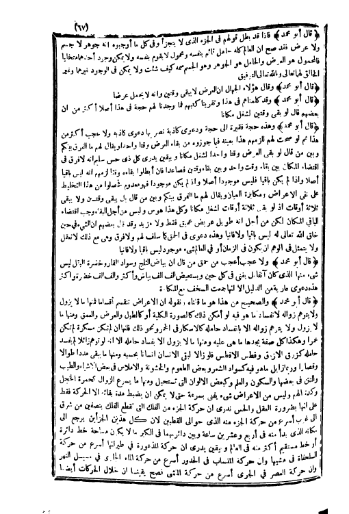قَالَ أَبُو مُحَمَّد وَهَذِه حجَّة فقيرة إِلَى حجَّة وَدَعوى كَاذِبَة نصر بهَا دَعْوَى كَاذِبَة وَلَا عجب أَكثر من هَذَا ثمَّ لَو صحت لَهُم للزمهم هَذَا بِعَيْنِه فِيمَا جوزوه من بَقَاء الْعرض وقتا وَاحِدًا وَيُقَال لَهُم مَا الْفرق بَيْنكُم وَبَين من قَالَ لَو بَقِي الْعرض وقتا وَاحِدًا لشغل مَكَانا وبيقين يدْرِي كل ذِي حس سليم أَنه لَا فرق فِي اقْتِضَاء الْمَكَان بَين بَقَاء وَقت وَاحِد وَبَين بَقَاء وَقْتَيْنِ فَصَاعِدا فَإِن أبطلوا بَقَاءَهُ وقتا لَزِمَهُم أَنه لَيْسَ بَاقِيا أصلا وَأَيْضًا لم يكن بَاقِيا فَلَيْسَ مَوْجُودا أصلا وَإِذ لم يكن مَوْجُودا فَهُوَ مَعْدُوم فحصلوا من هَذَا التَّخْلِيط على نفي الْأَعْرَاض ومكابرة العيان وَيُقَال لَهُم مَا الْفرق بَيْنكُم وَبَين من قَالَ بل يبْقى وَقْتَيْنِ وَلَا يبْقى ثَلَاثَة أَوْقَات إِذْ لَو بَقِي ثَلَاثَة أَوْقَات لشغل مَكَانا وكل هَذَا هوس وَلَيْسَ من أجل الْبَقَاء وَجب اقْتِضَاء الْبَاقِي الْمَكَان لَكِن من أجل أَنه طَوِيل عريض عميق فَقَط وَلَا مزِيد وَقد قَالَ بَعضهم أَن الشَّيْء فِي حِين خلق الله تَعَالَى لَهُ لَيْسَ بَاقِيا وَلَا فانياً وَهَذِه دَعْوَى فِي الْحمق كَمَا سلف لَهُم وَلَا فرق وَهِي مَعَ ذَلِك لَا تعقل وَلَا يتَمَثَّل فِي الْوَهم أَن يكون فِي الزَّمَان أَو فِي الْعَالم شَيْء مَوْجُود لَيْسَ بَاقِيا وَلَا فانياً
