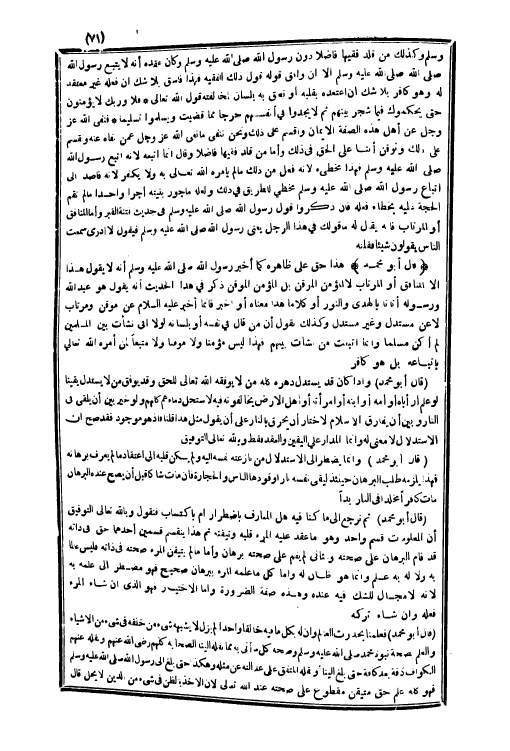 وَسلم وَكَذَلِكَ من قلد فَقِيها فَاضلا دون رَسُول الله صلى الله عَلَيْهِ وَسلم وَكَانَ عقده أَنه لَا يتبع رَسُول الله صلى الله عَلَيْهِ وَسلم إِلَّا إِن وَافق قَوْله قَول ذَلِك الْفَقِيه فَهَذَا فَاسق بِلَا شكّ أَن فعله غير مُعْتَقد لَهُ وَهُوَ كَافِر بِلَا شكّ أَن اعتقده بِقَلْبِه أَو نطق بِهِ بِلِسَان لمُخَالفَته قَول الله تَعَالَى {فَلَا وَرَبك لَا يُؤمنُونَ حَتَّى يُحَكِّمُوك فِيمَا شجر بَينهم ثمَّ لَا يَجدوا فِي أنفسهم حرجاً مِمَّا قضيت ويسلموا تَسْلِيمًا} فنفي الله عز وَجل عَن أهل هَذِه الصّفة الْإِيمَان وَأقسم على ذَلِك وَنحن ننفي مَا نفي الله عز وَجل عَمَّن نَفَاهُ عَنهُ وَيقسم على ذَلِك ونوقن أننا على الْحق فِي ذَلِك وَأما من قلد فَقِيها فَاضلا وَقَالَ إِنَّمَا اتبعهُ لِأَنَّهُ اتبع رَسُول الله صلى الله عَلَيْهِ وَسلم فَهَذَا مُخطئ لِأَنَّهُ فعل من ذَلِك مَا لم يَأْمُرهُ الله تَعَالَى بِهِ وَلَا يكفر لِأَنَّهُ قَاصد إِلَى اتِّبَاع رَسُول الله صلى الله عَلَيْهِ وَسلم مُخطئ للطريق فِي ذَلِك وَلَعَلَّه مأجور بنيته أجرا وَاحِدًا مَا لم نقم الْحجَّة عَلَيْهِ بخطأ فعله فَإِن ذكرُوا قَول رَسُول الله صلى الله عَلَيْهِ وَسلم فِي حَدِيث فتْنَة الْقَبْر وَأما الْمُنَافِق أَو المرتاب فَإِنَّهُ يُقَال لَهُ مَا قَوْلك فِي هَذَا الرجل يَعْنِي رَسُول الله صلى الله عَلَيْهِ وَسلم فَيَقُول لَا أَدْرِي سَمِعت النَّاس يَقُولُونَ شَيْئا فقلنه