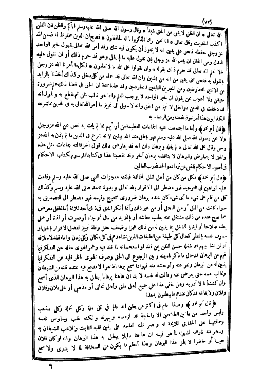 قَالَ أَبُو مُحَمَّد وَهَذَا عَام فِي أَكثر من يظنّ أَنه عَالم فِي كل مِلَّة وكل نحلة وكل مَذْهَب وَلَيْسَ وَاحِد من هَاتين الطَّائِفَتَيْنِ إِلَّا وَالْحجّة قد لَزِمته وبهرته وَلكنه غلب وساوس نَفسه وحماقتها على الْحَقَائِق اللائحة لَهُ وَنصر ظَنّه الْفَاسِد على يَقِين الثَّابِت وتلاعب الشَّيْطَان بِهِ وسخر مِنْهُ فأوهمه لشهوته لما هُوَ فِيهِ أَن هَا هُنَا دَلِيلا يبطل بِهِ هَذَا الْبُرْهَان وَأَنه لَو كَانَ فلَان حَيا أَو حَاضرا لأبطل هَذَا الْبُرْهَان وَهَذَا أعظم مَا يكون من السخافة لما لَا يدْرِي وَلَا سمع