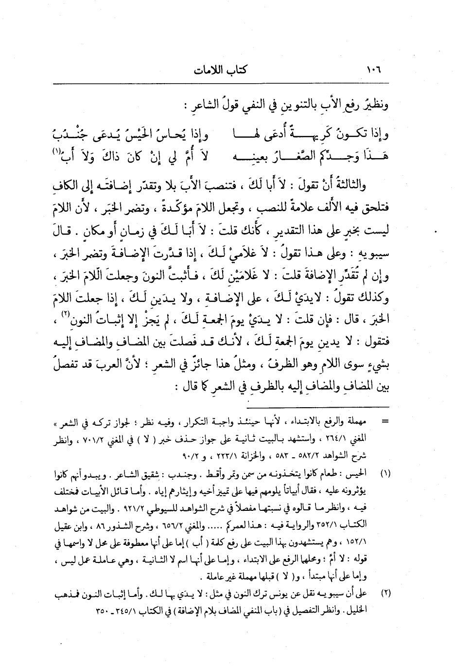 والثالثة أن تقول لا أبا لك فتنصب الأب بلا وتقدر إضافته إلى الكاف فتلحق فيه الألف علامة للنصب وتجعل اللام مؤكدة وتضمر الخبر لأن اللام ليست بخبر على هذا التقدير كأنك قلت لا أبا لك في زمان أو مكان قال: سيبويه وعلى هذا تقول لا غلامي لك إذا قدرت الإضافة وتضمر الخبر وإن لم تقدر الإضافة قلت لا غلامين لك فأثبت النون وجعلت اللام الخبر، وكذلك تقول لا يدي لك على الإضافة ولا يدين لك إذا جعلت اللام الخبر قال: فإن قلت لا يدي يوم الجمعة لك لم يجز إلا إثبات النون فتقول لا يدين يوم الجمعة لك لأنك قد فصلت بين المضاف والمضاف إليه بشيء سوى اللام وهو الظرف ومثل هذا جائز في الشعر لأن العرب قد تفصل بين المضاف والمضاف إليه بالظرف في الشعر كما قال