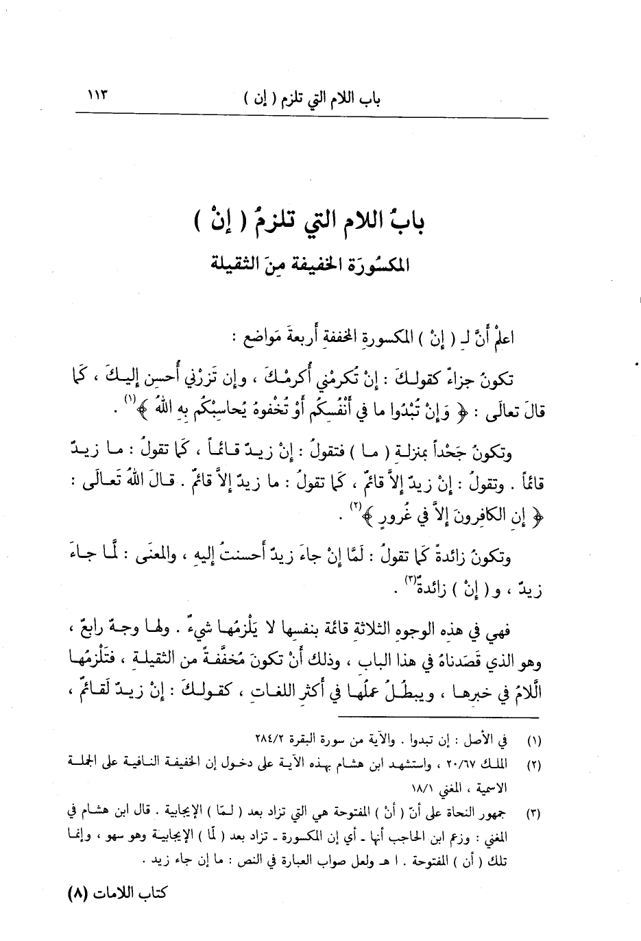 اعلم أن لإن المكسورة المخففة أربعة مواضع تكون جزاء كقولك: إن تكرمني أكرمك وإن تزرني أحسن إليك كما قال تعالى: (وَإِن تُبْدُواْ مَا فِي أَنفُسِكُمْ أَوْ تُخْفُوهُ يُحَاسِبْكُم بِهِ اللهُ) ؛ وتكون جحدا بمنزلة ما فتقول إن زيد قائما كما تقول ما زيد قائما وتقول إن زيد إلا قائم كما تقول ما زيد إلا قائم قال الله تعالى: (إِنِ الْكَافِرُونَ إِلَّا فِي غُرُورٍ) وتكون زائدة كما تقول لما إن جاء زيد أحسنت إليه والمعنى لما جاء زيد وإن زائدة فهي في هذه الوجوه الثلاثة قائمة بنفسها لا يلزمها شيء ولها وجه رابع وهو الذي قصدناه في هذا الباب وذلك أن تكون مخففة من الثقيلة فتلزمها اللام في خبرها ويبطل عملها في أكثر اللغات كقولك: إن زيد لقائم؛