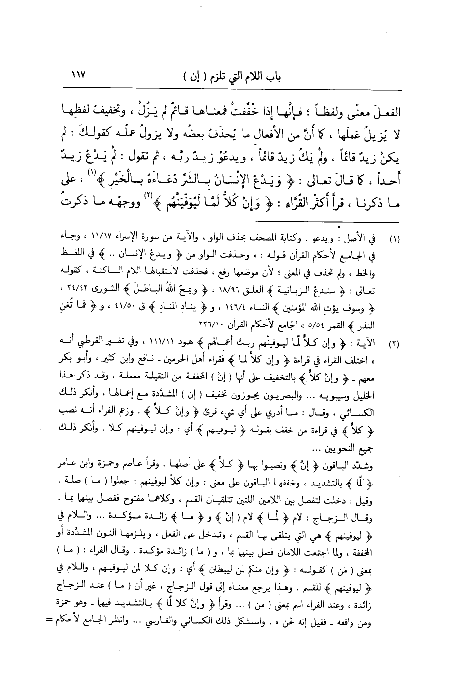 الفعل معنى ولفظا، فإنها إذا خففت فمعناها قائم لم يزل وتخفيف لفظها لا يزيل عملها كما أن من الأفعال ما يحذف بعضه ولا يزول عمله كقولك: لم يكن زيد قائما ولم يك زيد قائما ويدعو زيد ربه ثم تقول لم يدع زيد أحدا كما قال تعالى: (وَيَدْعُ الإِنسَانُ بِالشَّرِّ دُعَاءهُ بِالْخَيْرِ) ؛ على ما ذكرنا قرأ أكثر القراء وإن كلا لما ليوفينهم ووجهه ما ذكرت