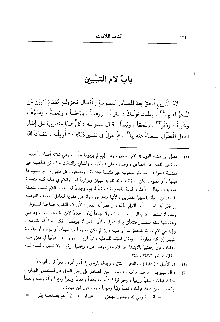 لام التبيين تلحق بعد المصادر المنصوبة بأفعال مخزولة مضمرة لتبين من المدعو له بها وذلك قولك سقيا ورعيا ورحبا ونعمة ومسرة وخيبة ودفرا وسحقا وبعدا قال: سيبويه كل هذا منصوب على إضمار الفعل المختزل استغناء عنه بها ثم نقول في تفسير ذلك تأويله سقاك الله