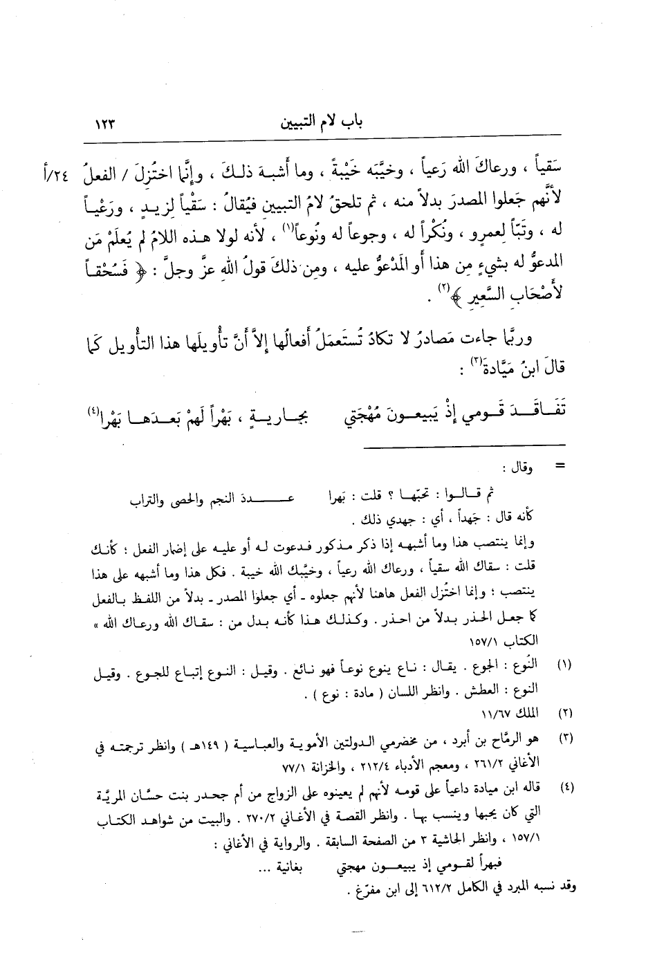 سقيا ورعاك الله رعيا وخيبه خيبة وما أشبه ذلك وإنما اختزل الفعل لأنهم جعلوا المصدر بدلا منه ثم تلحق لام التبيين فيقال سقيا لزيد ورعيا له وتبا لعمرو ونكرا له وجوعا له ونوعا لأنه لولا هذه اللام لم يعلم من المدعو له بشيء من هذا أو المدعو عليه، ومن ذلك قول الله عز وجل: (فسحقا لأصحاب السعير) وربما جاءت مصادر لا تكاد تستعمل أفعالها إلا أن تأويلها هذا التأويل كما قال ابن ميادة: