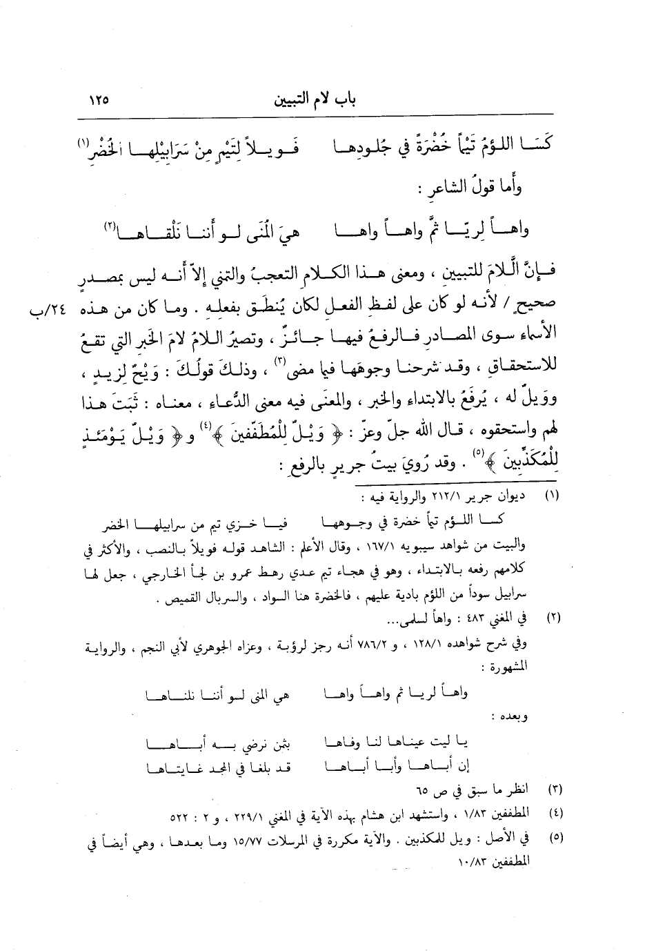 فإن اللام للتبيين ومعنى هذا الكلام التعجب والتمني إلا أنه ليس بمصدر صحيح لأنه لو كان على لفظ الفعل لكان ينطق بفعله وما كان من هذه الأسماء سوى المصادر فالرفع فيها جائز وتصير اللام لام الخبر التي تقع للاستحقاق، وقد شرحنا وجوهها فيما مضى وذلك قولك ويح لزيد وويل له يرفع بالأبتداء والخبر والمعنى فيه معنى الدعاء معناه ثبت هذا لهم واستحقوه قال الله جل وعز: (ويل للمطففين) و (ويل يومئذ للمكذبين) ، وقد روي بيت جرير بالرفع