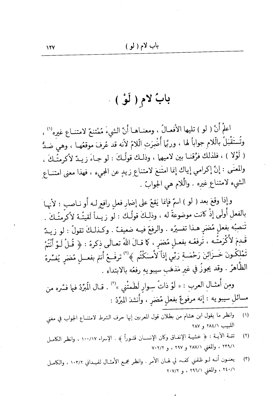وإذا وقع بعد لو اسم، فإنما يقع على إضمار فعل رافع له أو ناصب لأنها بالفعل أولى إذ كانت موضوعة له وذلك قولك لو زيدا لقيته لأكرمتك تنصبه بفعل مضمر هذا تفسيره والرفع فيه ضعيف، وكذلك تقول لو زيد قدم لأكرمته ترفعه بفعل مضمر كما قال الله تعالى ذكره: (قل لو أنتم تملكون خزائن رحمة ربي إذا لأمسكتم) ؛ ترفع أنتم بفعل مضمر يفسره الظاهر، وقد يجوز في غير مذهب سيبويه رفعه بالابتداء ومن أمثال العرب لو ذات سوار لطمتني قال المبرد فيما فسره من مسائل سيبويه إنه مرفوع بفعل مضمر.