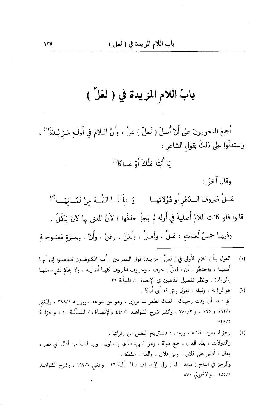قالوا فلو كانت اللام أصلية في أوله لم يجز حذفها لأن المعنى بها كان يكمل وفيها خمس لغات عل ولعل ولعن وعن وأن بهمزة مفتوحة