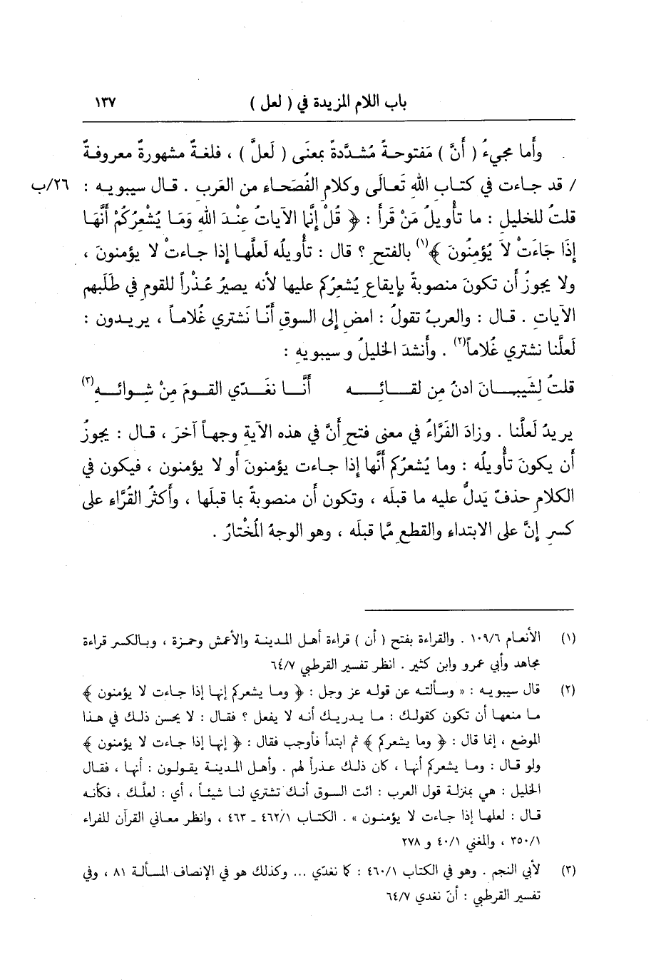 وأما مجيء أن مفتوحة مشددة بمعنى لعل فلغة مشهورة معروفة قد جاءت في كتاب الله تعالى وكلام الفصحاء من العرب قال: سيبويه قلت للخليل ما تأويل من قرأ قل إنما الآيات عند الله وما يشعركم أنها إذا جاءت لا يؤمنون بالفتح قال: تأويله لعلها إذا جاءت لا يؤمنون ولا يجوز أن تكون منصوبة بإيقاع يشعركم عليها لأنه يصير عذرا للقوم في طلبهم الآيات قال: والعرب تقول امض إلى السوق أنا نشتري غلاما يريدون لعلنا نشتري غلاما وأنشد الخليل وسيبويه: