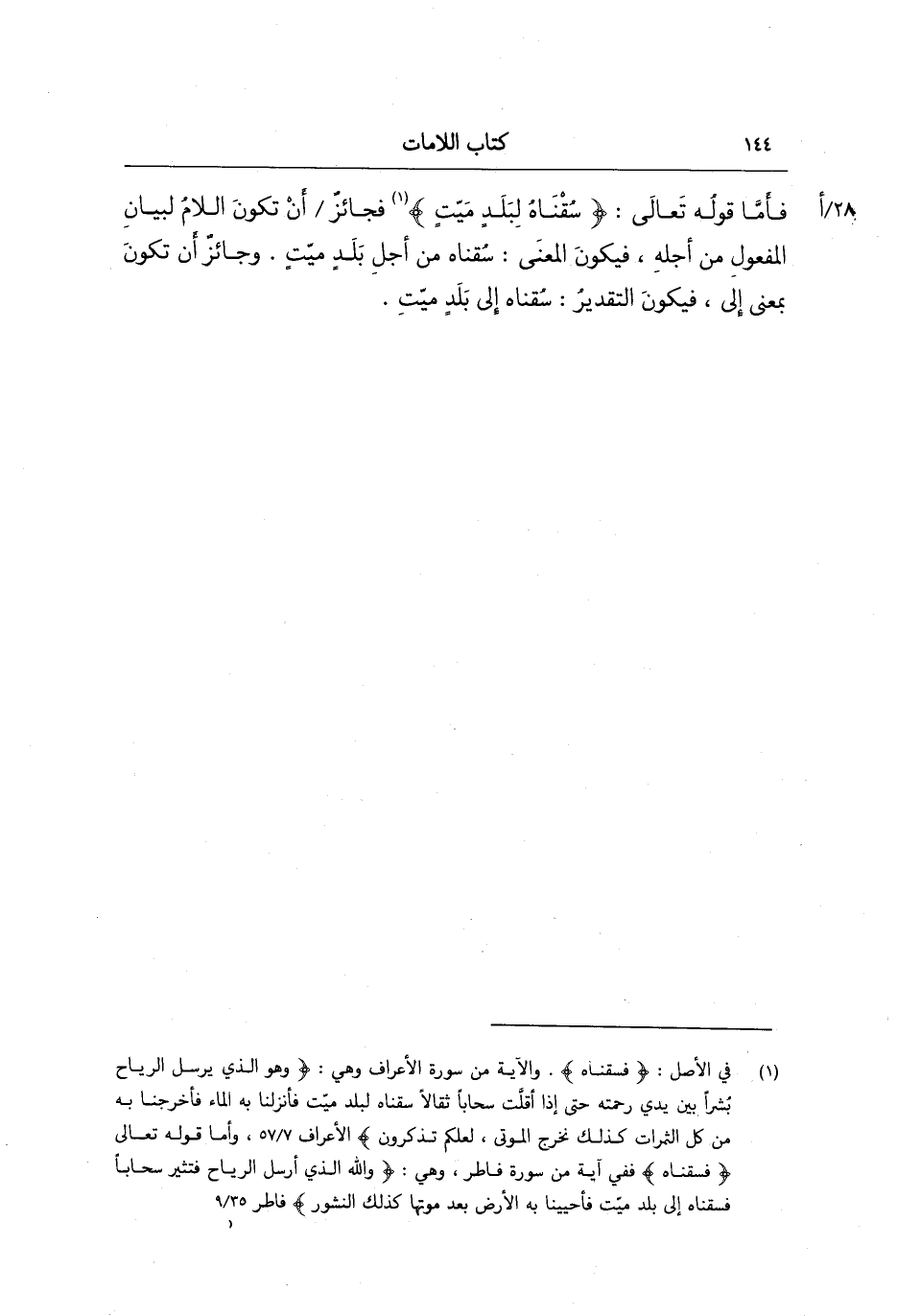 فأما قوله تعالى: (سُقْنَاهُ لِبَلَدٍ مَّيِّتٍ) ؛ فجائز أن تكون اللام لبيان المفعول من أجله فيكون المعنى سقناه من أجل بلد ميت وجائز أن تكون بمعنى إلى فيكون التقدير سقناه إلى بلد ميت.