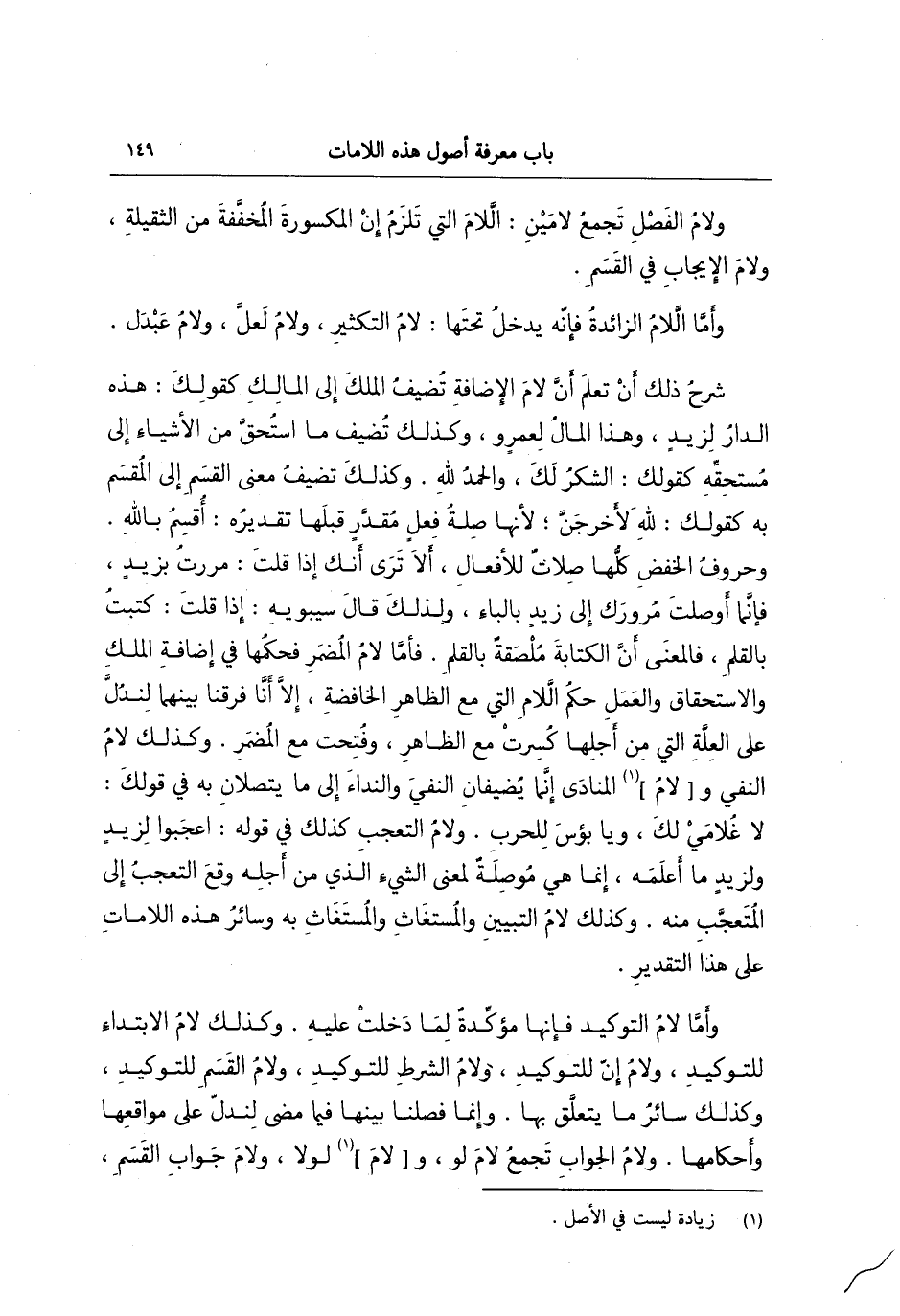ولام الفصل تجمع لامين اللام التي تلزم إن المكسورة المخففة من الثقيلة، ولام الإيجاب في القسم؛ وأما اللام الزائدة، فإنه يدخل تحتها لام التكثير، ولام لعل، ولام عبد لشرح ذلك أن تعلم أن لام الإضافة تضيف الملك إلى المالك كقولك: هذه الدار لزيد وهذا المال لعمرو، وكذلك تضيف ما استحق من الأشياء إلى مستحقه كقولك: الشكر لك والحمد لله، وكذلك تضيف معنى القسم إلى المقسم به كقولك: لله لأخرجن لأنها صلة فعل مقدر قبلها تقديره أقسم بالله وحروف الخفض كلها صلات للأفعال ألا ترى أنك إذا قلت مررت بزيد، فإن ما أوصلت مرورك إلى زيد بالباء ولذلك قال سيبويه: إذا قلت كتبت بالقلم فالمعنى أن الكتابة ملصقة بالقلم فأما لام المضمر فحكمها في إضافة الملك والاستحقاق والعمل حكم اللام التي مع الظاهر الخافضة إلا أنا فرقنا بينهما لندل على العلة التي من أجلها كسرت مع الظاهر وفتحت مع المضمر، وكذلك لام النفي، ولام المنادى إنما يضي، فإن النفي والنداء إلى ما يتصلان به وكذلك قولك: لا غلامي لك ويا بؤس للحرب، ولام التعجب كذلك في قوله اعجبوا لزيد ولزيد ما أعلمه إنما هي موصلة لمعنى الشيء الذي من أجله وقع التعجب إلى المتعجب منه، وكذلك لام التبيين والمستغاث والمستغاث به وسائر هذه اللامات على هذا التقدير؛ وأما لام التوكيد، فإنها مؤكدة لما دخلت عليه، وكذلك لام الابتداء للتوكيد، ولام إن للتوكيد، ولام الشرط للتوكيد، ولام القسم للتوكيد، وكذلك سائر ما يتعلق بها وإنما فصلنا بينها فيما مضى لندل على مواقعها وأحكامها، ولام الجواب تجمع لام لو، ولام لولا، ولام جواب القسم،