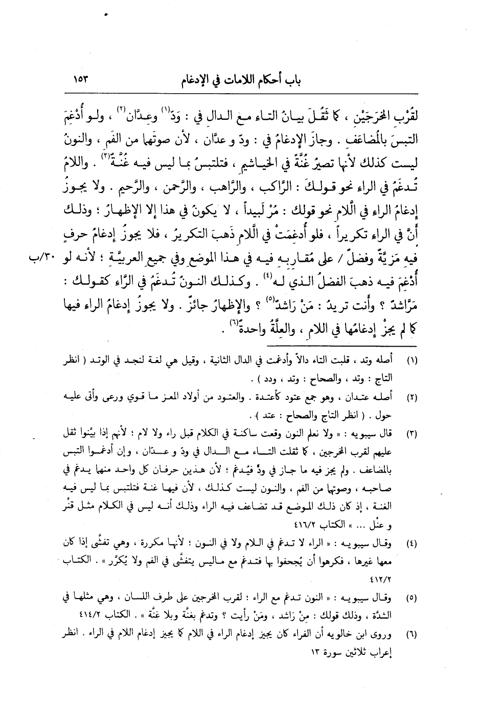 لقرب المخرجين كما ثقل بيان التاء مع الدال في ود وعدان ولو أدغم التبس بالمضاعف وجاز الإدغام في ود وعدان لأن صوتهما من الفم والنون ليست كذلك لأنها تصير غنة في الخياشيم فتلتبس بما ليس فيه غنة واللام تدغم في الراء نحو قولك الراكب والراهب والرحمن والرحيم ولا يجوز إدغام الراء في اللام نحو قولكك مر لبيدا لا يكون في هذا إلا الإظهار وذلك أن في الراء تكريرا فلو أدغمت في اللام ذهب التكرير فلا يجوز إدغام حرف فيه مزية وفضل على مقاربه فيه في هذا الموضع وفي جميع العربية لأنه لو أدغم فيه ذهب الفضل الذي له، وكذلك النون تدغم في الراء كقولك: مراشد وأنت تريد من راشد والإظهار جائز ولا يجوز إدغام الراء فيها كما لم يجز إدغامها في اللام والعلة واحدة.