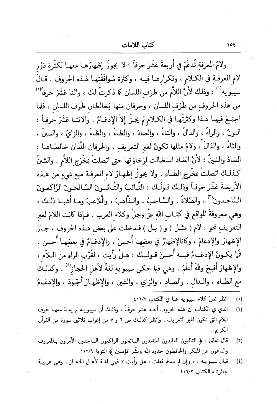 ولام المعرفة تدغم في أربعة عشر حرفا لا يجوز إظهارها معها لكثرة دور لام المعرفة في الكلام وتكرارها فيه وكثرة موافقتها لهذه الحروف قال: سيبويه وذلك لأن اللام من طرف اللسان كما ذكرت لك واثنا عشر حرفا من هذه الحروف من طرف اللسان وحر، فإن منها يخلطان طرف اللسان فلما اجتمع فيها هذا وكثرتها في الكلام لم يجز إلا الإدغام والاثنا عشر حرفا النون والراء والدال والتاء والصاد والطاء والظاء والزاي والسين والثاء والذال ولم مثلها تكون لغير التعريف والحر، فإن اللذان خالطاها الضاد والشين لأن الضاد استطالت لرخاوتها حتى اتصلت بمخرج اللام والشين كذلك اتصلت بمخرج الطاء ولا يجوز إظهار لام المعرفة مع شيء من هذه الأربعة عشر حرفا وذلك قولك التائب والتائبون السائحون الراكعون الساجدون والصلاة والساحب والذاهب واللاعب وما أشبه ذلك وهي معروفة المواقع في كتاب الله عز وجل وكلام العرب فإذا كانت اللام لغير التعريف نحو لام مثل وبل فدخلت على بعض هذه الحروف جاز الإظهار والإدغام وكان الإظهار في بعضها أحسن والإدغام في بعضها أحسن فمما يكون الإدغام فيه أحسن قولك هل رأيت لقرب الراء من اللام والإظهار أقبح ولله أعلم وهي فيما حكى سيبويه لغة لأهل الحجاز، وكذلك مع الطاء والدال والصاد والزاي والشين والإظهار أجود والإدغام