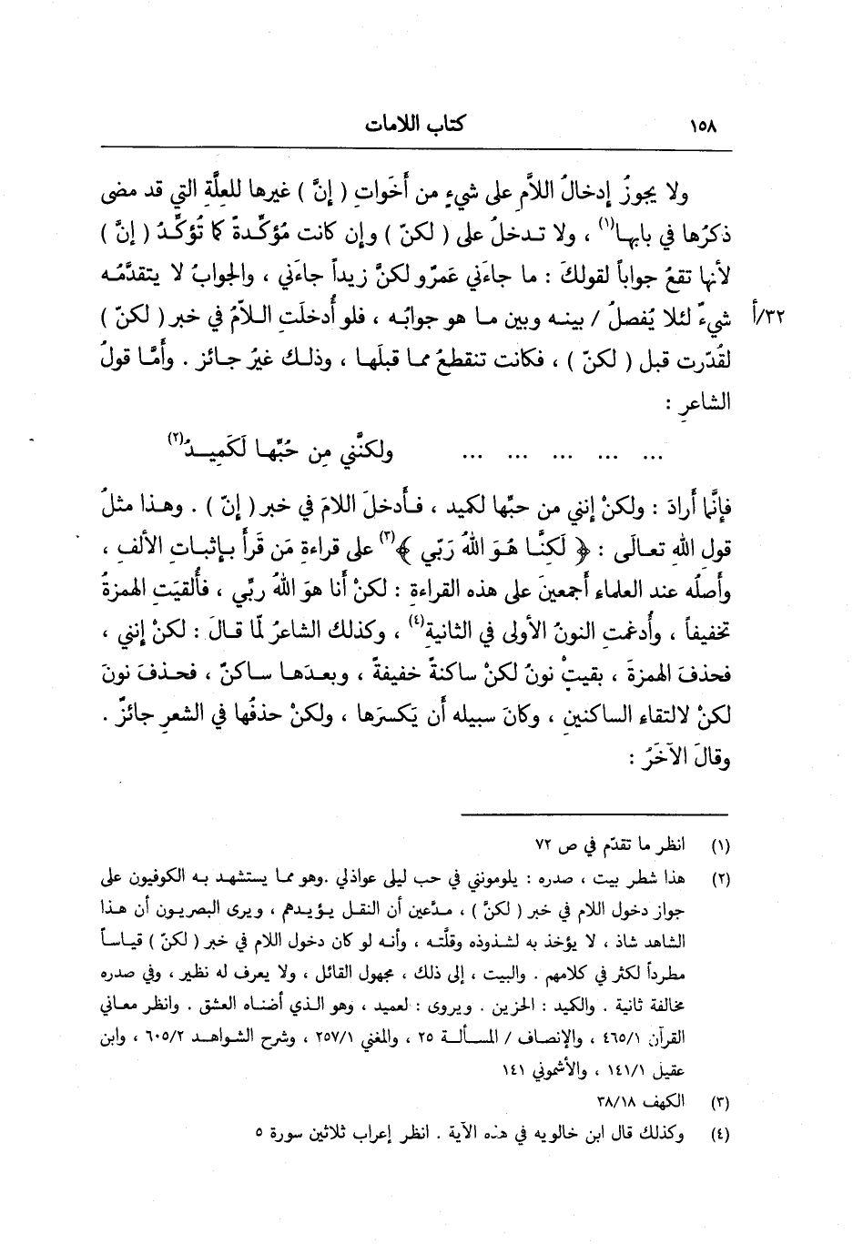 فإن ما أراد ولكن إنني من حبها لكميد فأدخل اللام في خبر إن وهذا مثل قول الله تعالى: (لكنا هو الله ربي) على قراءة من قرأ بإثبات الألف وأصله عند العلماء أجمعين على هذه القراءة لكن أنا هو الله ربي فألقيت الهمزة تخفيفا وأدغمت النون الأولى في الثانية، وكذلك الشاعر لما قال: لكن إنني فحذف الهمزة بقيت نون لكن ساكنة خفيفة وبعدها ساكن فحذف نون لكن لالتقاء الساكنين وكان سبيله أن يكسرها ولكن حذفها في الشعر جائز، وقال الآخر: