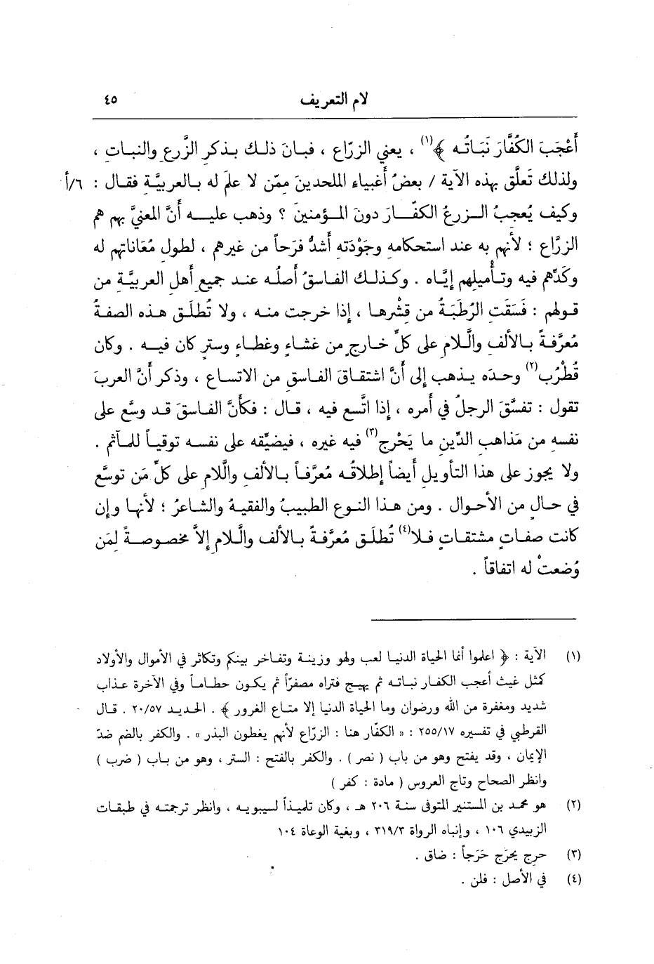 أَعْجَبَ الْكُفَّارَ نَبَاتُهُ) ؛ يعني الزراع فبان ذلك بذكر الزرع والنبات ولذلك تعلق بهذه الآية بعض أغبياء الملحدين ممن لا علم له بالعربية فقال وكيف يعجب الزرع الكفار دون المؤمنين وذهب عليه أن المعنى بهم هم الزراع لأنهم به عند استحكامه وجودته أشد فرحا من غيرهم لطول معاناتهم له وكدهم فيه وتأميلهم إياه، وكذلك الفاسق أصله عند جميع أهل العربية من قولهم فسقت الرطبة من قشرها إذا خرجت منه ولا تطلق هذه الصفة معرفة بالألف واللام على كل خارج من غشاء وغطاء وستر كان فيه وكان قطرب وحده يذهب إلى أن اشتقاق الفاسق من الاتساع وذكر أن العرب تقول تفسق الرجل في أمره إذا اتسع فيه قال: فكأن الفاسق قد وسع على نفسه من مذاهب الدين ما يحرج فيه غيره فيضيقه على نفسه توقيا للمآثم ولا يجوز على هذا التأويل أيضا إطلاقه معرفا بالألف واللام على كل من توسع في حال من الأحوال، ومن هذا النوع الطبيب والفقيه والشاعر لأنها وإن كانت صفات مشتقات فلا تطلق معرفة بالألف واللام إلا مخصوصة لمن وضعت له اتفاقا،