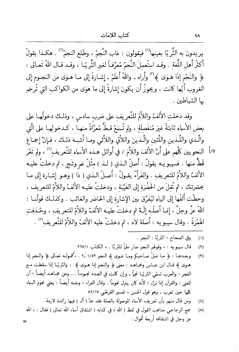 يريدون به الثريا بعينها فيقولون غاب النجم وطلع النجم هكذا يقول أكثر أهل اللغة، وقد استعمل النجم معرفا لغير الثريا، وقد قال الله تعالى: (وَالنَّجْمِ إِذَا هَوَى) ؛ وأراه والله أعلم إشارة إلى ما هوى من النجوم إلى الغروب أيها كانت ويجوز أن يكون إشارة إلى ما هوى من الكواكب التي ترجم بها الشياطين، وقد دخلت الألف واللام للتعريف على ضرب سادس وذلك دخولها على بعض الأسماء ثابتة غير منفصلة ولم تسمع قط معراة منها كدخولها على التي والذي واللذين واللتين والذين واللاتي واللائي وما أشبه ذلك، فإن إجماع النحويين كلهم على أن الألف واللام في أوائل هذه الأسماء للتعريف ولم تعر قط منها فسيبويه يقول: أصل الذي لذ مثل عم وشج ثم دخلت عليه الألف واللام للتعريف والفراء يقول أصل الذي ذا وهو إشارة إلى ما بحضرتك ثم نقل من الحضرة إلى الغيبة ودخلت عليه الألف واللام للتعريف وحطت ألفها إلى الياء ليفرق بين الإشارة إلى الحاضر والغائب، وكذلك قولنا الله عز وجل إنما أصله إله ثم دخلت عليه الألف واللام للتعريف وحذفت الهمزة، وقال سيبويه أصله لاه ثم دخلت عليه الألف واللام للتعريف