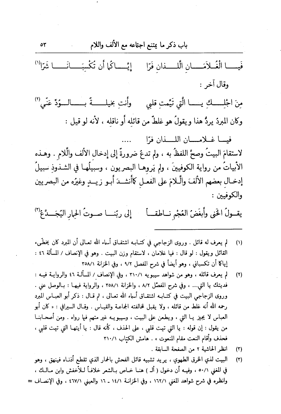 وكان المبرد يرد هذا ويقول هو غلط من قائله أو ناقله لأنه لو قيل فيا غلامان اللذان فرا لاستقام البيت وصح اللفظ به ولم تدع ضرورة إلى إدخال الألف واللام وهذه الأبيات من رواية الكوفيين ولم يروها البصريون وسبيلها في الشذوذ سبيل إدخال بعضهم الألف واللام على الفعل كما أنشد أبو زيد وغيره من البصريين والكوفيين يقول الخنى وأبغض العجم ناطقا إلى ربنا صوت الحمار اليجدع؛