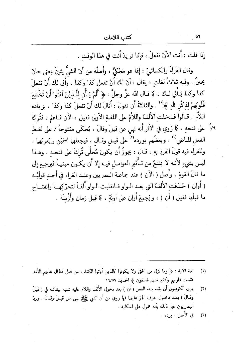 اذا قلت أنت الآن تفعل، فإن ما تريد أنت في هذا الوقت، وقال الفراء والكسائي إنما هو محكي وأصله من آن الشيء يئين بمعنى حان يحين وفيه ثلاث لغات يقال آن لك أن تفعل كذا وكذا وأنى لك أن تفعل كذا وكذا يأني لك كما قال الله عز وجل: (ألم يأن للذين آمنوا أن تخشع قلوبهم لذكر الله) ؛ والثالثة أن تقول أنال لك أن تفعل كذا وكذا بزيادة اللام قالوا فدخلت الألف واللام على اللغة الأولى فقيل الآن فاعلم فترك على فتحه كما روي في الأثر أنه نهى عن قيل، وقال يحكى مفتوحا على لفظ الفعل الماضي وبعضهم يورده على قيل، وقال فيجعلهما اسمين ويعربهما وللفراء فيه قول انفرد به قال: يجوز أن يكون محلى ترك على فتحه وهذا ليس بشيء لأنه لا يمتنع من تأثير العوامل فيه إلا أن يكون مبنيا فيرجع إلى ما قال القوم وأصل الآن عند جماعة البصريين وعند الفراء في أحد قوليه أوان حذفت الألف التي بعد الواو، فإن قلبت الواو ألفا لتحركها وانفتاح ما قبلها فقيل آن ويجمع أوان على آونة كما قيل زمان وأزمنة