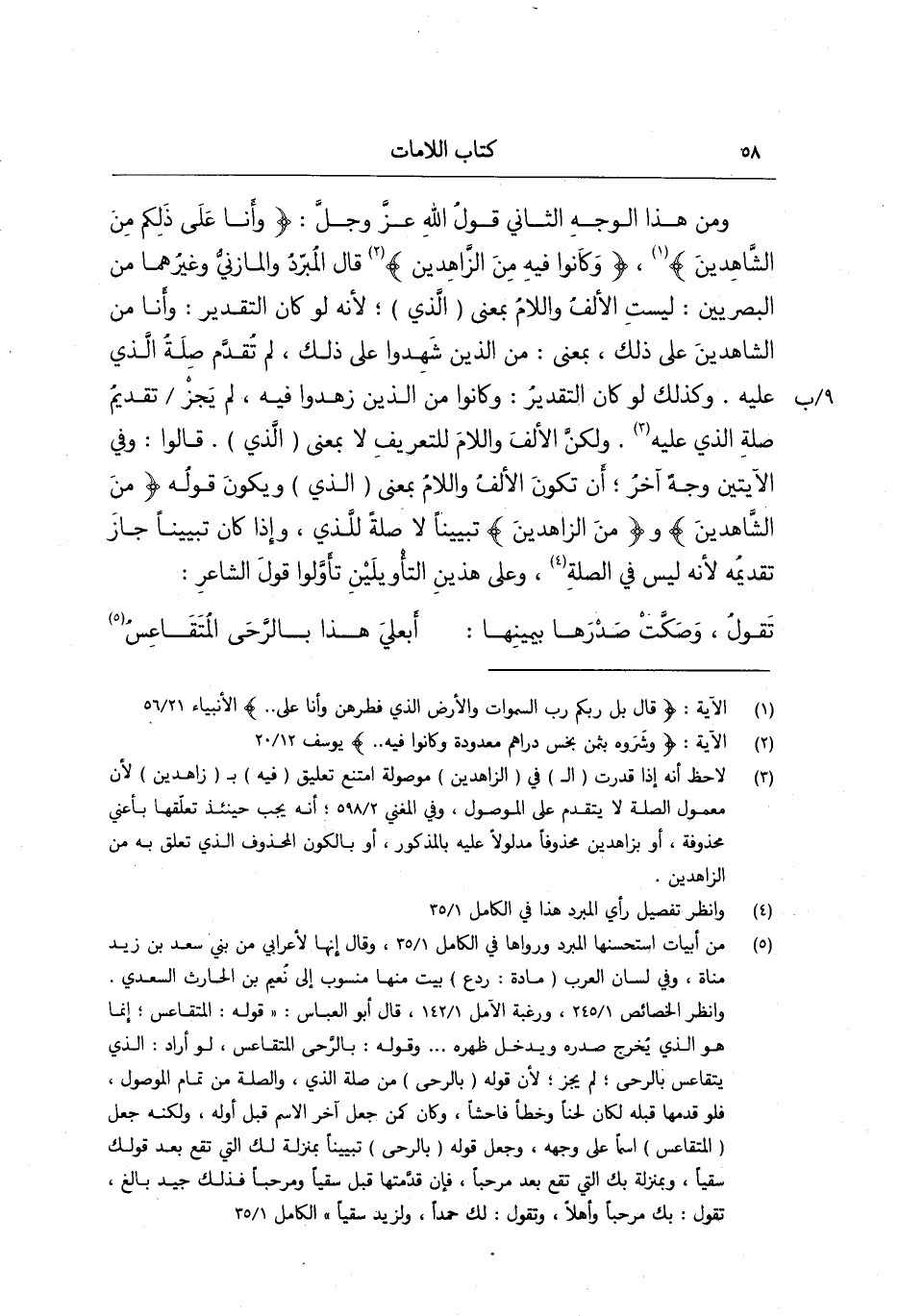 ومن هذا الوجه الثاني قول الله عز وجل: وأنا على ذلكم من الشاهدين وكانوا فيه من الزاهدين قال المبرد والمازني: وغيرهما من البصريين ليست الألف واللام بمعنى الذي لأنه لو كان التقدير وأنا من الشاهدين على ذلك بمعنى من الذين شهدوا على ذلك لم تقدم صلة الذي عليه، وكذلك لو كان التقدير وكانوا من الذين زهدوا فيه لم يجز تقديم صلة الذي عليه ولكن الألف واللام للتعريف لا بمعنى الذي قالوا وفي الآيتين وجه آخر أن تكون الألف واللام بمعنى الذي ويكون قوله من الشاهدين ومن الزاهدين تبيينا لا صلة للذي وإذا كان تبيينا جاز تقديمه لأنه ليس في الصلة وعلى هذين التأويلين تأولوا قول الشاعر: