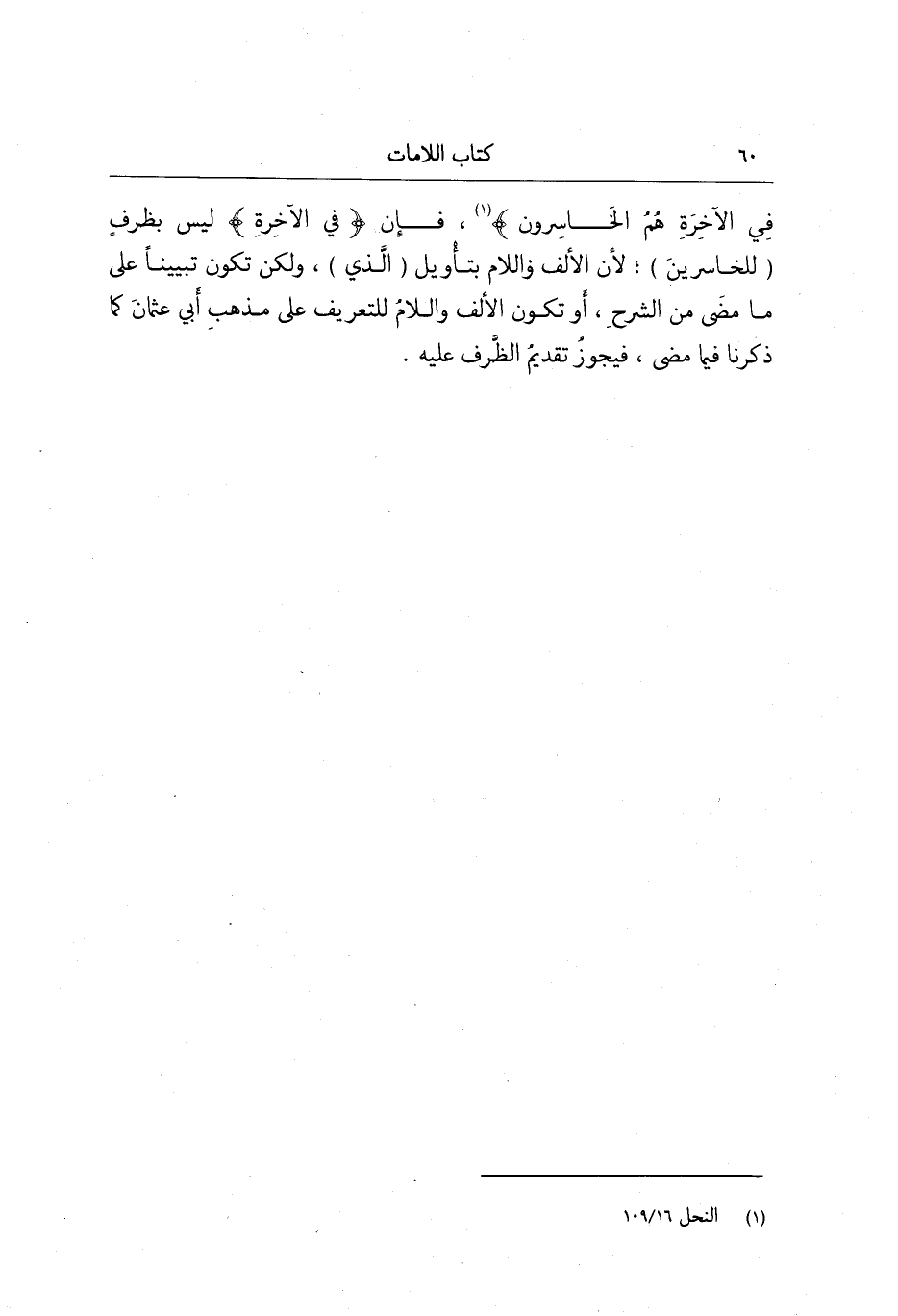 فإن (في الآخرة) ليس بظرف للخاسرين لأن الألف واللام بتأويل الذي ولكن تكون تبيينا على ما مضى من الشرح أو تكون الألف واللام للتعريف على مذهب أبي عثمان كما ذكرنا فيما مضى فيجوز تقديم الظرف عليه.