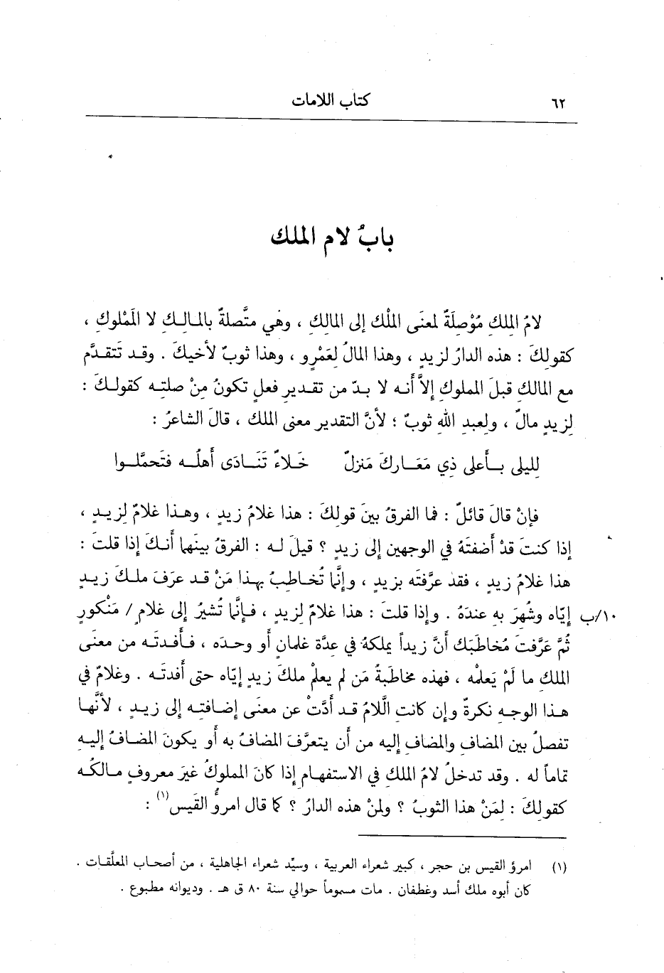فإن قال قائل فما الفرق بين قولك هذا غلام زيد وهذا غلام لزيد إذا كنت قد أضفته في الوجهين إلى زيد قيل له الفرق بينهما أنك إذا قلت هذا غلام زيد فقد عرفته بزيد وإنما تخاطب بهذا من قد عرف ملك زيد إياه وشهر به عنده وإذا قلت هذا غلام لزيد، فإن ما تشير إلى غلام منكور ثم عرفت مخاطبك أن زيدا يملكه في عدة غلمان أو وحده فأفدته من معنى الملك ما لم يعلمه فهذه مخاطبة من لم يعلم ملك زيد إياه حتى أفدته وغلام في هذا الوجه نكرة وإن كانت اللام قد أدت عن معنى إضافته إلى زيد لأنها تفصل بين المضاف والمضاف إليه من أن يتعرف المضاف به أو يكون المضاف إليه تماما له، وقد تدخل لآم الملك في الاستفهام إذا كان المملوك غير معروف مالكه كقولك: لمن هذا الثوب ولمن هذه الدار كما قال امرؤ القيس: