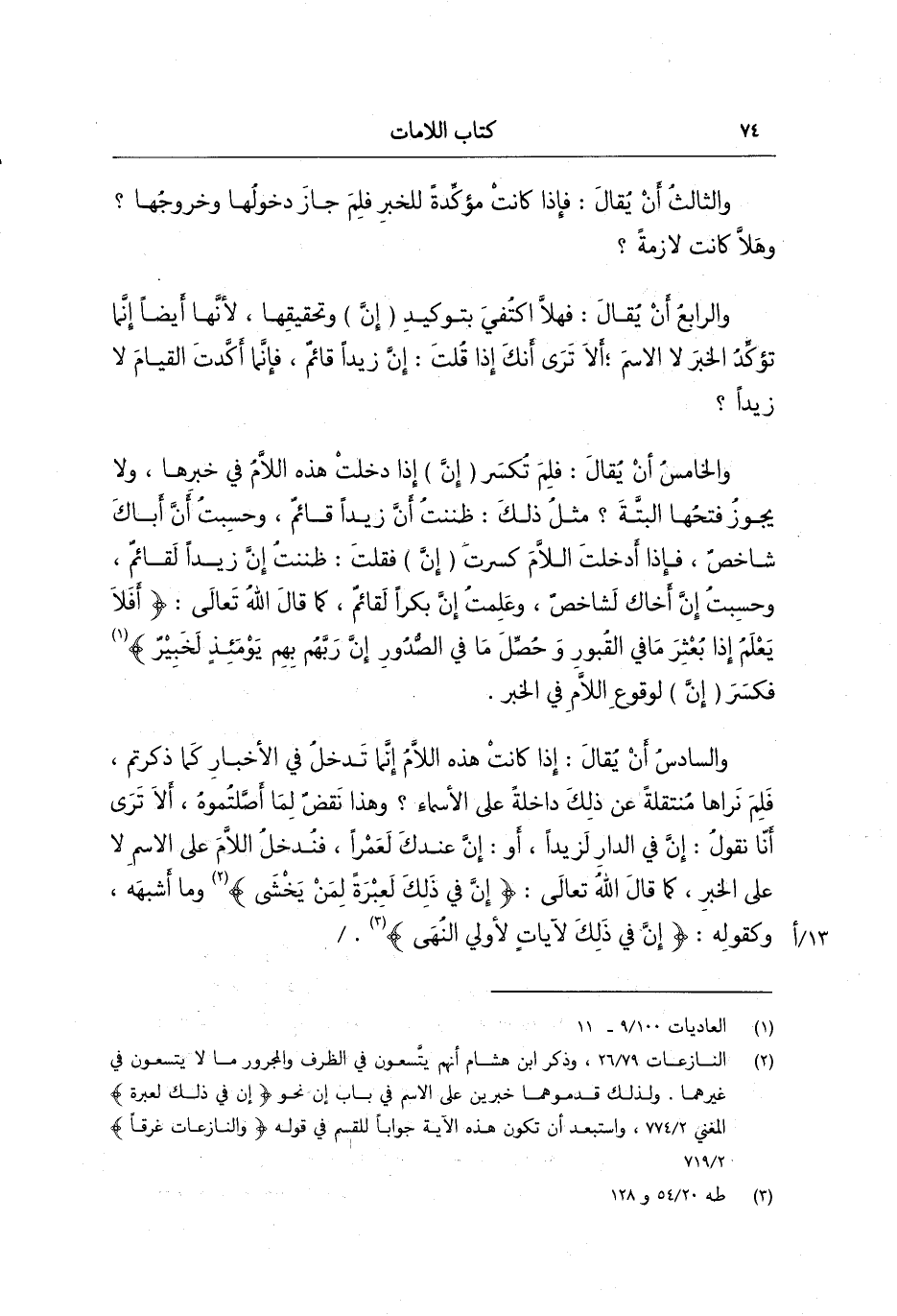 والثالث أن يقال فإذا كانت مؤكدة للخبر فلم جاز دخولها وخروجها وهلا كانت لازمة؛ والرابع أن يقال فهلا اكتفى بتوكيد إن وتحقيقها لأنها أيضا إنما تؤكد الخبر لا الاسم ألا ترى أنك إذا قلت إن زيدا قائم، فإن ما أكدت القيام لا زيدا؛ والخامس أن يقال فلم تكسر إن إذا دخلت هذه اللام في خبرها ولا يجوز فتحها البتة مثل ذلك ظننت أن زيدا قائم وحسبت أن أباك شاخص فإذا أدخلت اللام كسرت إن فقلت ظننت إن زيدا لقائم وحسبت إن أخاك لشاخص وعلمت إن بكرا لقائم كما قال الله تعالى: (إِنَّ رَبَّهُم بِهِمْ يَوْمَئِذٍ لَّخَبِيرٌ) فكسر إن لوقوع اللام في الخبر الخبر والسادس أن يقال إذا كانت هذه اللام إنما تدخل في الأخبار كما ذكرتم فلم نراها منتقلة عن ذلك داخلة على الأسماء وهذا نقض لما أصلتموه ألا ترى أنا نقول إن في الدار لزيدا أو إن عندك لعمرا فندخل اللام على الاسم لا على الخبر كما قال الله تعالى: (إِنَّ فِي ذَلِكَ لَعِبْرَةً لِّمَن يَخْشَى) ؛ وما أشبهه وكقوله: (إن في ذلك لآيات أولي النهى) .