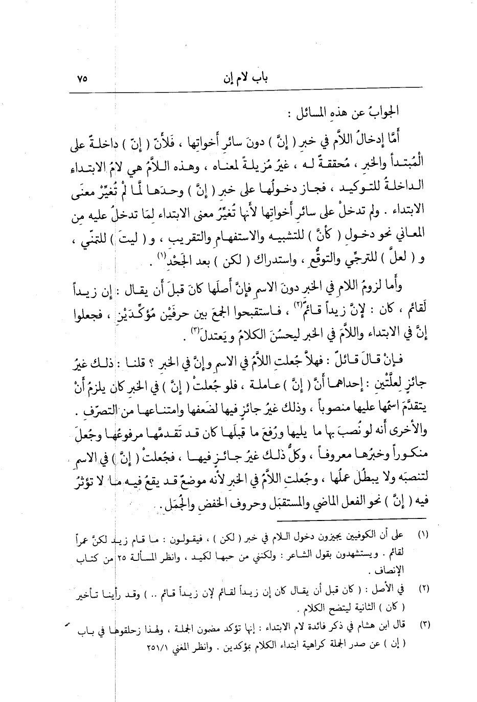 أما إدخال اللام في خبر إن دون سائر أخواتها فلأن إن داخلة على المبتدأ والخبر محققة له غير مزيلة لمعناه وهذه اللام وهي لام الابتداء الداخلة للتوكيد فجاز دخولها على خبر إن وحدها لما لم تغير معنى الابتداء ولم تدخل على سائر أخواتها لأنها تغير معنى الابتداء لما تدخل عليه من المعاني نحو دخول كأن للتشبيه والاستفهام والتقريب وليت للتمني ولعل للترجي والتوقع واستدراك لكن بعد الجحد؛ وأما لزوم اللام في الخبر دون الاسم، فإن أصلها كان قبل أن يقال إن زيدا لقائم كان لأن زيدا قائم فاستقبحوا الجمع بين حرفين مؤكدين فجعلوا إن في الابتداء واللام في الخبر ليحسن الكلام ويعتدل، فإن قال قائل فهلا جعلت اللام في الاسم وإن في الخبر قلنا ذلك غير جائز لعلتين إحداهما أن إن عاملة فلو جعلت إن في الخبر كان يلزم أن يتقدم اسمها عليها منصوبا وذلك غير جائز فيها لضعفها وامتناعها من التصرف والأخرى أنه لو نصب بها ما يليها ورفع ما قبلها كان قد تقدمها مرفوعها وجعل منكورا وخبرها معروفا وكل ذلك غير جائز فيها فجعلت إن في الاسم لتنصبه ولا يبطل عملها وجعلت اللام في الخبر لأنه موضع قد يقع فيه ما لا تؤثر فيه إن نحو الفعل الماضي والمستقبل وحروف الخفض والجمل؛