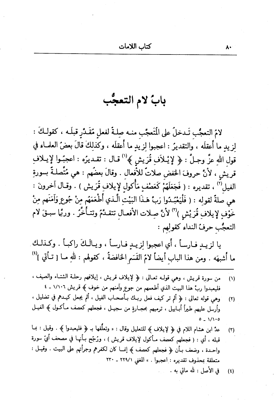 لام التعجب تدخل على المتعجب منه صلة لفعل مقدر قبله كقولك: لزيد ما أعقله والتقدير اعجبوا لزيد ما أعقله، وكذلك قال: بعض العلماء في قول الله عز وجل: (لإيلاف قريش) ؛ قال: تقديره اعجبوا لإيلاف قريش لأن حروف الخفض صلات للأفعال، وقال بعضهم هي متصلة بسورة الفيل تقديره فجعلهم كعصف مأكول لإيلاف قريش؛، وقال آخرون هي صلة لقوله (فليعبدوا رب هذا البيت الذي أطعمهم من جوع وآمنهم من خوف) لأن صلات الأفعال تتقدم وتتأخر وربما سبق لام التعجب حرف النداء كقوله: م يا لزيد فارسا أي اعجبوا لزيد فارسا ويالك راكبا، وكذلك ما أشبهه، ومن هذا الباب أيضا لام القسم الخافضة كقوله: م لله ما تأتي