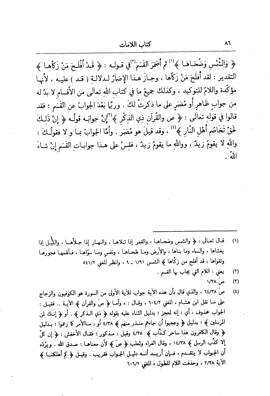 : (وَالشَّمْسِ وَضُحَاهَا) ؛ ثم أضمر القسم في قوله قد أفلح من زكاها؛ التقدير لقد أفلح من زكاها وجاز هذا الإضمار لدلالة قد عليه لأنها مؤكدة واللام للتوكيد، وكذلك جميع ما في كتاب الله تعالى من الأقسام لا بد له من جواب ظاهر أو مضمر على ما ذكرت لك وربما بعد الجواب عن القسم فقد قالوا في قوله تعالى: (ص وَالْقُرْآنِ ذِي الذِّكْرِ) ؛ إن جوابه قوله: إن ذلك لحق تخاصم أهل النار، وقد قيل هو مضمر؛ وأما الجواب بما ولا فقولك والله لا يقوم زيد ووالله ما يقوم زيد فقس على هذا جوابات القسم إن شاء الله.