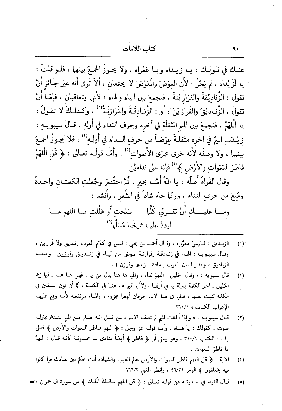 عنك وكذلك قولك: يا زيداه ويا عمراه ولا يجوز الجمع بينهما فلو قلت يا لزيداه لم يجز لأن العوض والمعوض لا يجتمعان ألا ترى أنه غير جائز أن تقول الزناديقة والفرازينة فتجمع بين الياء والهاء لأنهما يتعاقبان فإما أن تقول الزناديق والفرازين أو الزنادقة والفرازنة، وكذلك لا تقول يا اللهم فتجمع بين الميم المثقلة في آخره وحرف النداء في أوله قال سيبويه زيدت الميم في آخره مثقلة عوضا من حرف النداء في أوله فلا يجوز الجمع بينهما ولا وصفه لأنه جرى مجرى الأصوات؛ وأما قوله تعالى: (قل اللهم فاطر السموات والأرض) ، فإنه على نداءين وقال الفراء أصله يا الله أمنا بخير ثم اختصر وجعلت الكلمتان واحدة ومنع من حرف النداء وربما جاء شاذا في الشعر وأنشد: