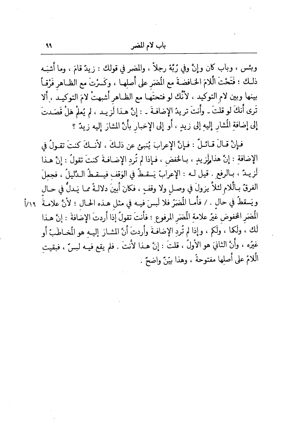 وبئس وباب كان وإن وفي ربه رجلا والمضمر وكذلك قولك: زيد قام وما أشبه ذلك فتحت اللام الخافضة مع المضمر على أصلها وكسرت مع الظاهر فرقا بينها وبين لام التوكيد لأنك لو فتحتها مع الظاهر أشبهت لام التوكيد ألا ترى أنك لو قلت وأنت تريد الإضافة إن هذا لزيد لم يعلم هل قصدت إلى إضافة المشار إليه إلى زيد أو إلى الإخبار بأن المشار إليه زيد، فإن قال قائل، فإن الإعراب ينبئ عن ذلك لأنك كنت تقول في الإضافة إن هذا لزيد بالخفض فإذا لم ترد الإضافة كنت تقول إن هذا لزيد بالرفع قيل له الإعراب يسقط في الوقف فيسقط الدليل فجعل الفرق باللام لئلا يزول في وصل ولا وقف فكان أبين دلالة مما يدل في حال ويسقط في حال فأما المضمر فلا لبس في مثل هذه الحال لأن علامة المضمر المخفوض غير علامة المضمر المرفوع، فإن ت تقول إذا أردت الإضافة إن هذا لك ولكما ولكم وإذا لم ترد الإضافة وأردت أن المشار إليه هو المخاطب أو غيره وأن الثاني هو الأول قلت إن هذا لأنت فلم يقع فيه لبس فبقيت اللام على أصلها مفتوحة وهذا بين واضح