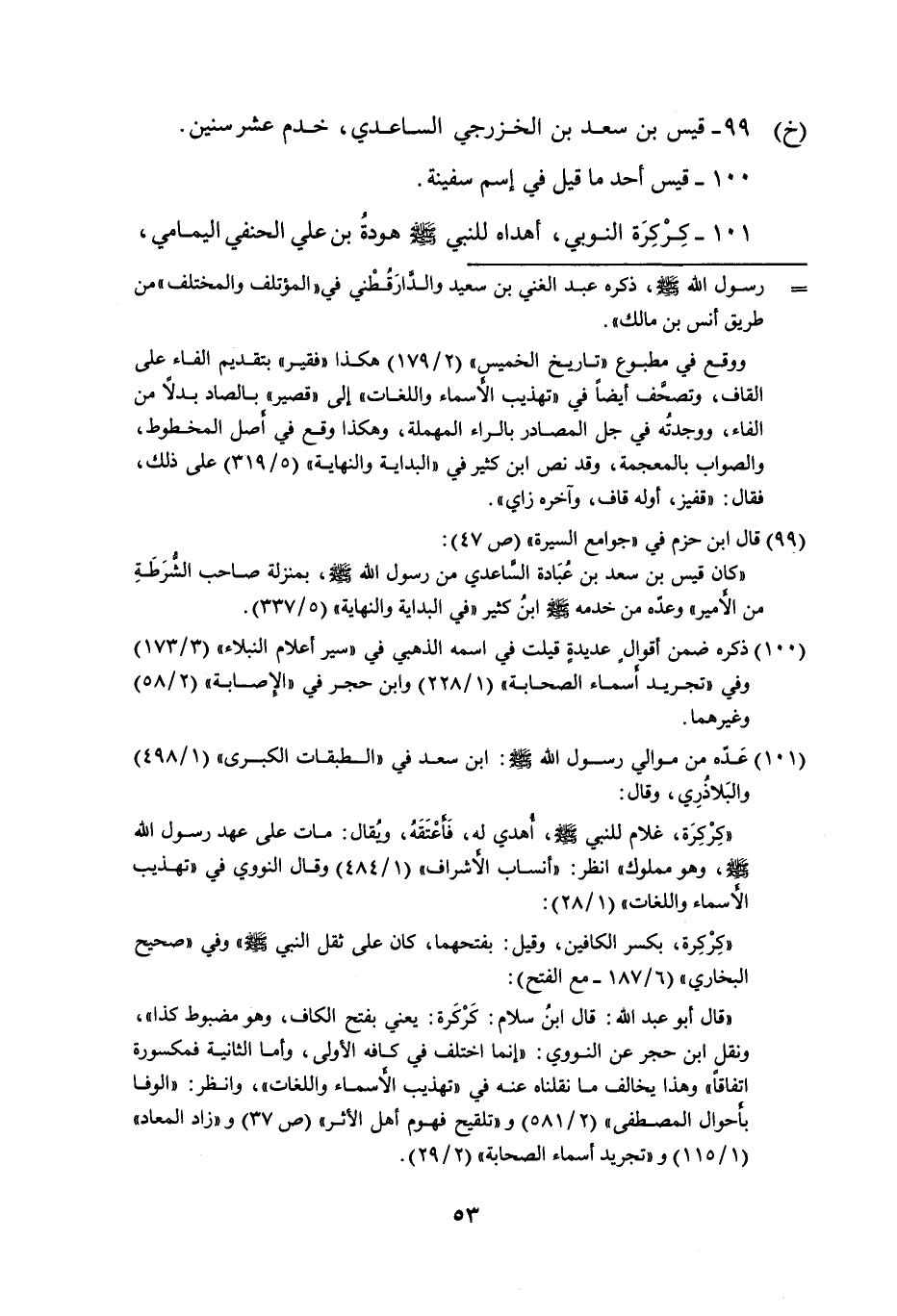 78 - صَالح أحد مَا قيل فِي إسم أبي رَافع القبطي 79 - ضميرَة بن أبي ضميرَة الضمرِي اللَّيْثِيّ قيل إسمه روح وَالْمَعْرُوف أَبَا ضميرَة وَهُوَ جد حُسَيْن بن عبد الله أعتق النَّبِي صلى الله عَلَيْهِ وَسلم أَبَا ضميرَة وَأهل بَيته وَكَانُوا أهل بَيت من الْعَرَب 80 - طهْمَان فِي ذكْوَان 81 - طهْمَان أحد مَا قيل فِي إسم سفينة 82 - عبد الله وَقيل عبيد بن عبد الغافر (خَ} 3 - عبد الله بن مَسْعُود وَكَانَ صَاحب نَعْلَيْه إِذا قَامَ ألبسهُ إيَّاهُمَا وَإِذا