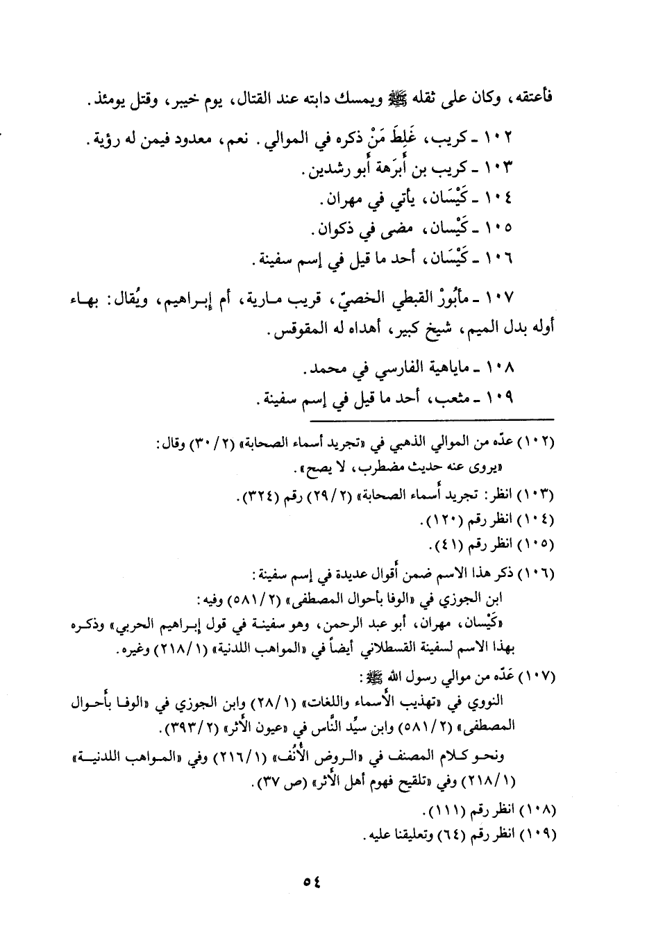 جلس جَعلهمَا فِي ذراعه حَتَّى يقوم وَصَاحب سواكه ويوقظه إِذا نَام ويستره إِذا اغْتسل ويرحل لَهُ إِذا سَافر ويماشيه 84 - عبد الرَّحْمَن أحد مَا قيل فِي إسم أبي رَافع القبطي 85 - عَبدة ذكره ابْن شاهين فِي الموَالِي 86 - عبس أحد مَا قيل فِي إسم سفينة 87 - عبيد الله بن اسْلَمْ الْهَاشِمِي 88 - عبيد بن عبد الغافر ذكره ابْن الْجَوْزِيّ وَغَيره وَهُوَ فِي عبد الله 89 - عبيد يُقَال هُوَ سعد الْمَاضِي (خَ) 90 - عقبَة بن عَامر الْجُهَنِيّ وَكَانَ صَاحب بغلته يَقُود بِهِ فِي الْأَسْفَار
