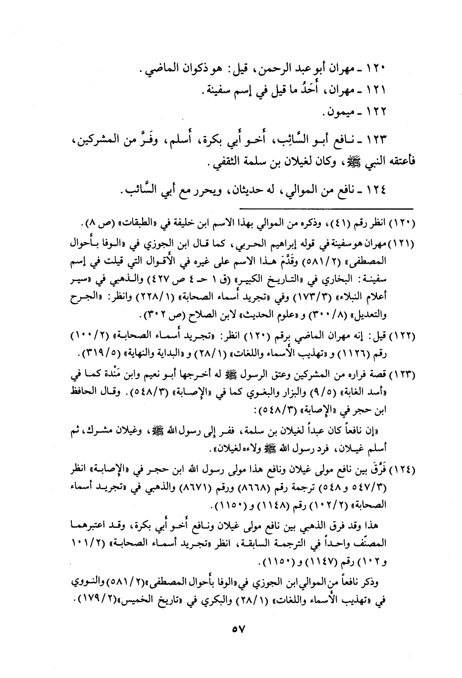 فَأعْتقهُ وَكَانَ على ثقله صلى الله عَلَيْهِ وَسلم ويمسك دَابَّته عِنْد الْقِتَال يَوْم خَيْبَر وَقتل يَوْمئِذٍ 102 - كريب غلط من ذكره فِي الموَالِي نعم مَعْدُود فِيمَن لَهُ رُؤْيَة 103 - كريب بن أَبْرَهَة ابو رشدين 104 - كيسَان يَأْتِي فِي مهْرَان 105 - كيسَان مضى فِي ذكْوَان 106 - كيسَان أحد مَا قيل فِي إسم سفينة 107 - مَأْبُور القبطي الْخصي قريب مَارِيَة أم إِبْرَاهِيم وَيُقَال بهاء أَوله بدل الْمِيم شيخ كَبِير أهداه لَهُ الْمُقَوْقس 108 - ماياهية الْفَارِسِي فِي مُحَمَّد 109 - مثعب أحد مَا قيل فِي إسم سفينة