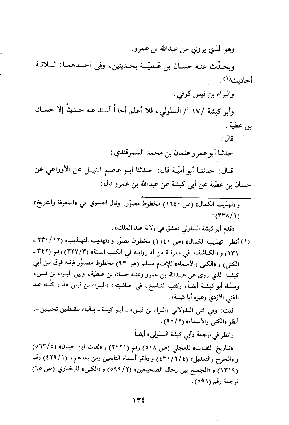 قَالَ: حَدَّثَنَا أَبُو عَمْرٍو عُثْمَانُ بْنُ مُحَمَّدٍ السَّمَرْقَنْدِيُّ، قَالَ: حَدَّثَنَا أَبُو أُمَيَّةَ، قَالَ: حَدَّثَنَا أَبُو عَاصِمٍ النَّبِيلُ عَنِ الْأَوْزَاعِيِّ عَنْ حَسَّانَ بْنِ عَطِيَّةَ عَنْ أَبِي كَبْشَةَ عَنْ عَبْدِ اللَّهِ بْنِ عَمْرٍو قَالَ -[135]-: قَالَ رَسُولُ اللَّهِ صَلَّى اللهُ عَلَيْهِ وَسَلَّمَ: §«مَنْ كَذَبَ عَلَيَّ مُتَعَمِّدًا فَلْيَتَبَوَّأْ مَقْعَدَهُ مِنَ النَّارِ»