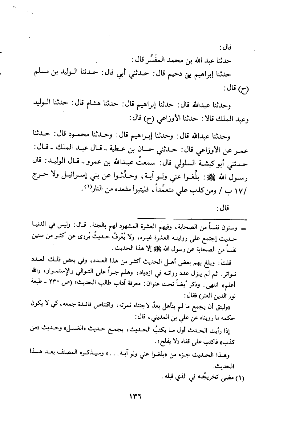 حَدَّثَنَا عَبْدُ اللَّهِ بْنُ مُحَمَّدٍ الْمُفَسِّرُ، قَالَ حَدَّثَنَا إِبْرَاهِيمُ بْنُ دُحَيْمٍ قَالَ: حَدَّثَنِي أَبِي، قَالَ: حَدَّثَنَا الْوَلِيدُ بْنُ مُسْلِمٍ ح قَالَ: وَحَدَّثَنَا عَبْدُ اللَّهِ، قَالَ: حَدَّثَنَا إِبْرَاهِيمُ، قَالَ: حَدَّثَنَا هِشَامٌ، قَالَ: حَدَّثَنَا الْوَلِيدُ وَعَبْدُ الْمَلِكِ قَالَا: حَدَّثَنَا الْأَوْزَاعِيُّ ح قَالَ: وَحَدَّثَنَا عَبْدُ اللَّهِ قَالَ: وَحَدَّثَنَا إِبْرَاهِيمُ قَالَ: وَحَدَّثَنَا مَحْمُودٌ، قَالَ: حَدَّثَنَا عُمَرُ عَنِ الْأَوْزَاعِيِّ قَالَ: حَدَّثَنِي حَسَّانُ بْنُ عَطِيَّةَ قَالَ عَبْدُ الْمَلِكِ قَالَ: حَدَّثَنِي أَبُو كَبْشَةَ السَّلُولِيُّ قَالَ: سَمِعْتُ عَبْدَ اللَّهِ بْنَ عَمْرٍو قَالَ الْوَلِيدُ: قَالَ رَسُولُ اللَّهِ صَلَّى اللهُ عَلَيْهِ وَسَلَّمَ: §«بَلِّغُوا عَنِّي وَلَوْ آيَةً وَحَدِّثُوا عَنْ بَنِي إِسْرَائِيلَ وَلَا حَرَجَ، وَمَنْ كَذَبَ عَلَيَّ مُتَعَمِّدًا فَلْيَتَبَوَّأْ مَقْعَدَهُ مِنَ النَّارِ»
