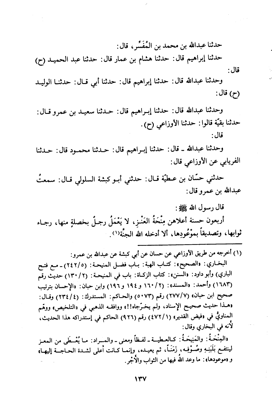 حَدَّثَنَا عَبْدُ اللَّهِ بْنُ مُحَمَّدِ بْنِ الْمُفَسِّرِ، قَالَ: حَدَّثَنَا إِبْرَاهِيمُ، قَالَ: حَدَّثَنَا هِشَامُ بْنُ عَمَّارٍ، قَالَ: حَدَّثَنَا عَبْدُ الْحَمِيدِ ح قَالَ: وَحَدَّثَنَا عَبْدُ اللَّهِ، قَالَ: حَدَّثَنَا إِبْرَاهِيمُ، قَالَ: حَدَّثَنَا أَبِي، قَالَ: حَدَّثَنَا الْوَلِيدُ ح قَالَ: وَحَدَّثَنَا عَبْدُ اللَّهِ، قَالَ: حَدَّثَنَا إِبْرَاهِيمُ، قَالَ: حَدَّثَنَا سَعِيدُ بْنُ عَمْرٍو، قَالَ: حَدَّثَنَا بَقِيَّةُ قَالُوا: حَدَّثَنَا الْأَوْزَاعِيُّ ح قَالَ: وَحَدَّثَنَا عَبْدُ اللَّهِ، قَالَ: حَدَّثَنَا إِبْرَاهِيمُ، قَالَ: حَدَّثَنَا مَحْمُودٌ، قَالَ: حَدَّثَنَا الْفِرْيَابِيُّ عَنِ الْأَوْزَاعِيِّ قَالَ: حَدَّثَنِي حَسَّانُ بْنُ عَطِيَّةَ قَالَ: حَدَّثَنِي أَبُو كَبْشَةَ السَّلُولِيُّ قَالَ: سَمِعْتُ عَبْدَ اللَّهِ بْنَ عَمْرٍو قَال: قَالَ: قَالَ رَسُولُ اللَّهِ صَلَّى اللهُ عَلَيْهِ وَسَلَّمَ: §«أَرْبَعُونَ حَسَنَةً أَعْلَاهُنَّ مِنْحَةُ الْعَنْزِ لَا يَعْمَلُ الرَّجُلُ بِخَصْلَةٍ مِنْهَا رَجَاءَ ثَوَابِهَا وَتَصْدِيقًا بِمَوْعُودِهَا إِلَّا أَدْخَلَهُ اللَّهُ الْجَنَّةَ» -[138]- قَالَ الْفِرْيَابِيُّ: «إِلَّا أَثَابَهُ اللَّهُ بِهِ الْجَنَّةَ» ، وَقَالَ عَبْدُ الْحَمِيدِ: «وَتَصْدِيقُ مَوْعُودِهَا» وَمِمَّا يَتَمَيَّزُ بِهِ أَبُو كَبْشَةَ السَّلُولِيُّ عَنِ الْبَرَاءِ بْنِ قَيْسٍ أَنَّ أَبَا كَبْشَةَ رَجُلٌ مِنْ هَوَازِنَ، وَهَوَازِنُ تَرْجِعُ إِلَى مُضَرَ وَالْبَرَاءُ بْنُ قَيْسٍ رَجُلٌ مِنَ السَّكُونِ، وَالسَّكُونُ مِنَ الْيَمَنِ وَيُمَيِّزُهُ أَيْضًا مِنَ الْبَرَاءِ بْنِ قَيْسٍ أَمْرٌ آخَرُ، وَذَاكَ أَنَّ الْكُنْيَةَ مُتَّفِقَةٌ فِي الْخَطِّ مُخْتَلِفَةٌ فِي اللَّفْظِ وَالْمَعْنَى، وَذَاكَ أَنَّ السَّلُولِيَّ يُكَنَّى أَبَا كَبْشَةَ بِالْبَاءِ الْمُعْجَمَةِ بِوَاحِدَةٍ وَبِالشِّينِ الْمُعْجَمَةِ، وَالْبَرَاءُ بْنُ قَيْسٍ يُكَنَّى بِأَبِي كَيْسَةَ بِالْيَاءِ الْمُعْجَمَةِ بِاثْنَتَيْنِ مِنْ تَحْتِهَا وَسِينٍ لَا تُعْجَمُ -[139]- وَلِقَوْلِنَا إِنَّ السَّلُولِيَّ رَجُلٌ مِنْ أَهْلِ الشَّامِ حُجَّةٌ، حَدَّثَنَا بِهَا أَبُو سُلَيْمَانَ مُحَمَّدُ بْنُ عَبْدِ اللَّهِ الرَّبْعِيُّ، قَالَ: حَدَّثَنَا أَحْمَدُ بْنُ عُمَرَ، قَالَ: حَدَّثَنَا مَحْمُودُ بْنُ إِبْرَاهِيمَ بْنِ سُمَيْعٍ أَنَّهُ ذَكَرَ فِي تَارِيخِهِ فِي الطَّبَقَةِ الثَّالِثَةِ مِنْ تَابِعِي أَهْلِ الشَّامِ أَبَا كَبْشَةَ السَّلُولِيَّ فَقَالَ: وَأَبُو كَبْشَةَ السَّلُولِيُّ مِنْ قَيْسٍ قَدِمَ عَلَى عَبْدِ الْمَلِكِ -[140]-. وَلِقَوْلِنَا فِي الْبَرَاءِ بْنِ قَيْسٍ حُجَّةٌ أُخْرَى هِيَ تَفْرِيقُ مُسْلِمِ بْنِ الْحَجَّاجِ بَيْنَهَا، فَذَكَرَ السَّلُولِيَّ فِي الشَّامِيِّينَ وَذَكَرَ الْبَرَاءَ فِي الْكُوفِيِّينَ قَالَ: حَدَّثَنَا عَبْدُ اللَّهِ بْنُ جَعْفَرِ بْنِ الْوَرْدِ، عَنْ عَبْدِ اللَّهِ بْنِ أَحْمَدَ الْخَفَّافِ، عَنْ مُسْلِمِ بْنِ الْحَجَّاجِ، أَنَّهُ ذَكَرَ أَبَا كَبْشَةَ السَّلُولِيَّ فِي تَابِعِي أَهْلِ الشَّامِ قَالَ: وَحَدَّثَنَا أَبُو مُحَمَّدِ بْنُ وَرْدٍ، قَالَ: حَدَّثَنَا عَبْدُ اللَّهِ بْنُ أَحْمَدَ الْحَقَّافُ قَالَ: حَدَّثَنَا مُسْلِمُ بْنُ الْحَجَّاجِ، أَنَّهُ ذَكَرَ فِي الطَّبَقَةِ الْأُولَى مِنْ تَابِعِي أَهْلِ الْكُوفَةِ الْبَرَاءَ بْنَ قَيْسٍ، قَالَ: وَأَخْبَرَنِي أَبُو الْحَسَنِ عَلِيُّ بْنُ أَحْمَدَ بْنِ زُكُرُونَ فِي كِتَابِهِ إِلَيَّ أَنَّ أَبَا مُسْلِمٍ صَالِحَ بْنَ أَحْمَدَ بْنِ عَبْدِ اللَّهِ بْنِ صَالِحٍ الْكُوفِيَّ حَدَّثَهُمْ أَنَّ أَبَاهُ ذَكَرَ فِي تَارِيخِهِ فِي تَابِعِي أَهْلِ الْكُوفَةِ فَقَالَ -[141]-: أَبُو كَيْسَةَ كُوفِيُّ تَابِعِيُّ ثِقَةٌ ب