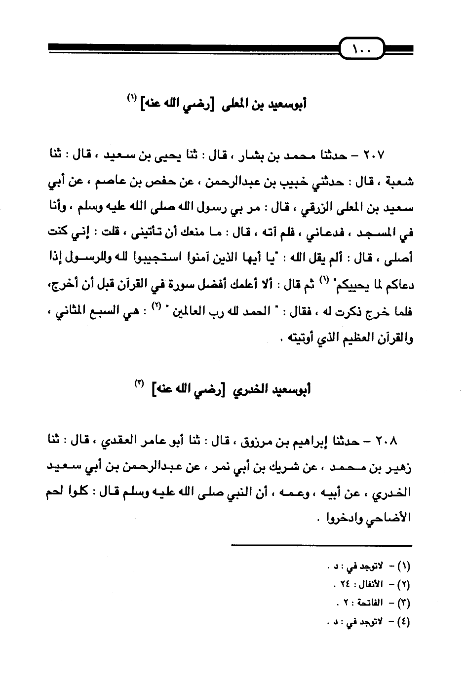 207 - حَدَّثَنَا مُحَمَّدُ بْنُ بَشَّارٍ قَالَ:، ثَنَا يَحْيَى بْنُ سَعِيدٍ قَالَ:، ثَنَا شُعْبَةُ قَالَ: حَدَّثَنِي خُبَيْبُ بْنُ عَبْدِ الرَّحْمَنِ، عَنْ حَفْصِ بْنِ عَاصِمٍ عَنْ أَبِي سَعِيدِ بْنِ الْمُعَلَّى الزُّرَقِيِّ قَالَ: مَرَّ بِي رَسُولُ اللَّهِ صَلَّى اللهُ عَلَيْهِ وَسَلَّمَ وَأَنَا فِي الْمَسْجِدِ فَدَعَانِي فَلَمْ آتِهِ قَالَ: «مَا مَنَعَكَ أَنْ تَأْتِيَنِي» ؟ قُلْتُ: إِنِّي كُنْتُ أُصَلِّي. قَالَ " أَلَمْ يَقُلِ اللَّهُ: {يَا أَيُّهَا الَّذِينَ آمَنُوا اسْتَجِيبُوا لِلَّهِ وَلِلرَّسُولِ إِذَا دَعَاكُمْ لَمَّا يُحْيِيكُمْ} [الأنفال: 24] ثُمَّ قَالَ: «§أَلَا أُعَلِّمُكَ أَفْضَلَ سُورَةٍ فِي الْقُرْآنِ قَبْلَ أَنْ أَخْرُجَ» ؟ فَلَمَّا خَرَجَ ذَكَرْتُ لَهُ فَقَالَ: «الْحَمْدُ لِلَّهِ رَبِّ الْعَالَمِينَ هِيَ السَّبْعُ الْمَثَانِي وَالْقُرْآنُ الْعَظِيمُ الَّذِي أُوتِيتُهُ»