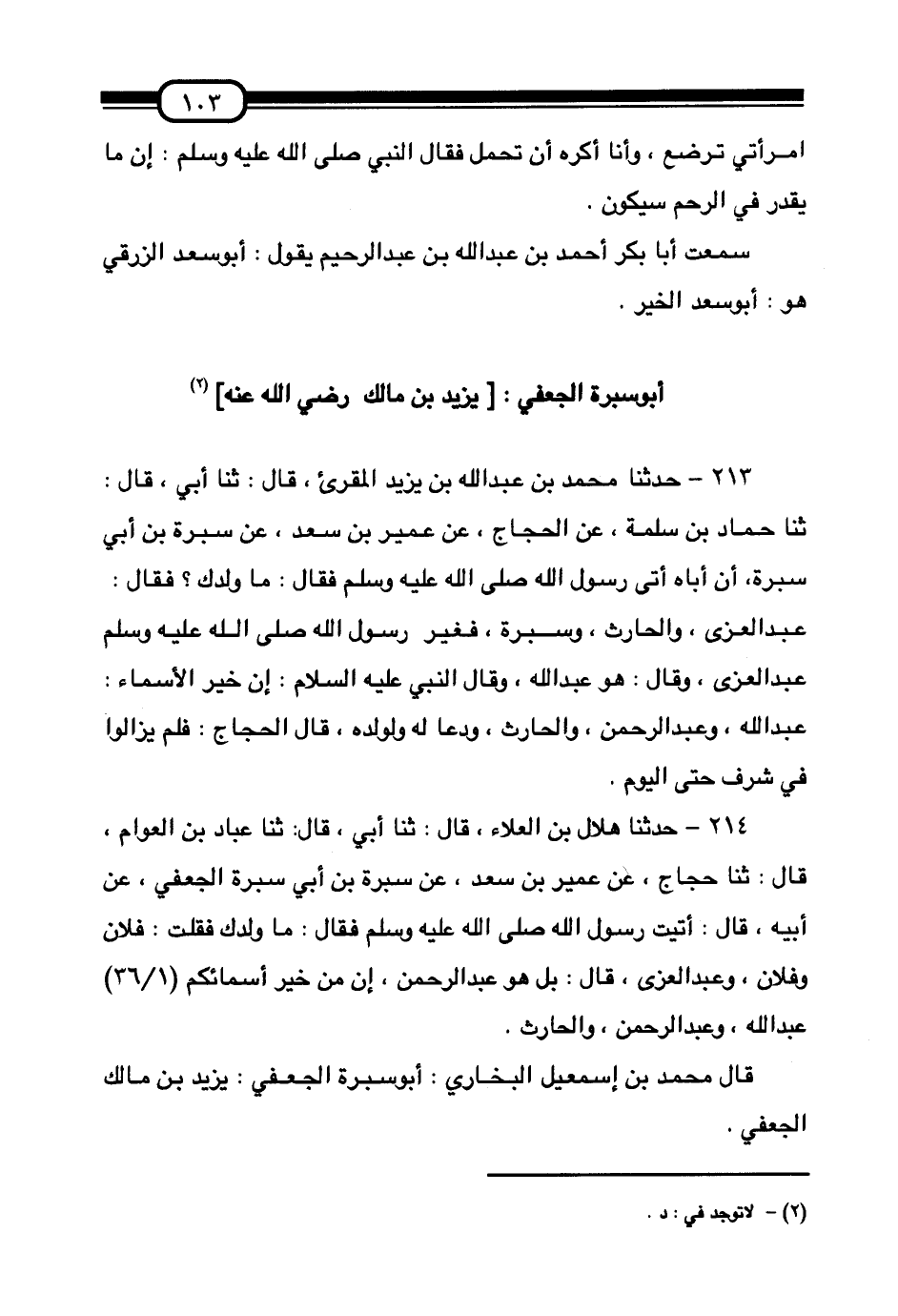 214 - حَدَّثَنَا هِلَالُ بْنُ الْعَلَاءِ قَالَ:، ثَنَا أَبِي قَالَ:، ثَنَا عَبَّادُ بْنُ الْعَوَّامِ قَالَ:، ثَنَا حَجَّاجٌ، عَنْ عُمَيْرِ بْنِ سَعْدٍ، عَنْ سَبْرَةَ بْنِ أَبِي سَبْرَةَ الْجُعْفِيِّ، عَنْ أَبِيهِ قَالَ: أَتَيْتُ رَسُولَ اللَّهِ صَلَّى اللهُ عَلَيْهِ وَسَلَّمَ فَقَالَ: «مَا وَلَدُكَ» ؟ فَقُلْتُ: فُلَانٌ وَفُلَانٌ وَعَبْدُ الْعُزَّى، قَالَ: «بَلْ هُوَ عَبْدُ الرَّحْمَنِ إِنَّ §مِنْ خَيْرِ أَسْمَائِكُمْ عَبْدَ اللَّهِ وَعَبْدَ الرَّحْمَنِ وَالْحَارِثَ» قَالَ مُحَمَّدُ بْنُ إِسْمَاعِيلَ الْبُخَارِيُّ: أَبُو سَبْرَةَ الْجُعْفِيُّ يَزِيدُ بْنُ مَالِكٍ الْجُعْفِيُّ "