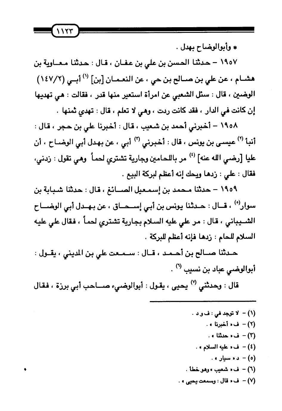 1959 - حَدَّثَنَا مُحَمَّدُ بْنُ إِسْمَاعِيلَ الصَّائِغُ قَالَ: حَدَّثَنَا شَبَابَةُ بْنُ سِوَارٍ قَالَ: حَدَّثَنَا يُونُسُ بْنُ أَبِي إِسْحَاقَ عَنْ بَهْدَلٍ أَبِي الْوَضَّاحِ الشَّيْبَانِيِّ قَالَ: مَرَّ عَلِيٌّ عَلَيْهِ السَّلَامُ بِجَارِيَةٍ تَشْتَرِي لَحْمًا؟ فَقَالَ عَلِيٌّ عَلَيْهِ السَّلَامُ لِلَّحَّامِ: «§زِدْهَا فَإِنَّهُ أَعْظَمُ لِلْبَرَكَةِ» حَدَّثَنَا صَالِحُ بْنُ أَحْمَدَ قَالَ: سَمِعْتُ عَلِيَّ بْنَ الْمَدِينِيِّ يَقُولُ: أَبُو الْوَضِيِّ عَبَّادُ بْنُ نَسِيبٍ. قَالَ: وَحَدَّثَنِي يَحْيَى يَقُولُ: «أَبُو الْوَضِيءِ صَاحِبُ أَبِي بَرْزَةَ» ، فَقَالَ -[1124]- لَهُ: النَّجِيبِيُّ هَكَذَا قَالَ وَهْبُ بْنُ جَرِيرٍ