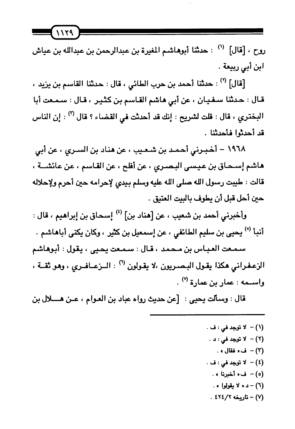 1968 - أَخْبَرَنِي أَحْمَدُ بْنُ شُعَيْبٍ، عَنْ هَنَّادِ بْنِ السَّرِيِّ، عَنْ أَبِي هَاشِمٍ إِسْحَاقَ بْنِ عِيسَى الْبَصْرِيِّ عَنْ أَفْلَحَ، عَنِ الْقَاسِمِ، عَنْ عَائِشَةَ قَالَتْ: «§طَيَّبْتُ رَسُولَ اللَّهِ صَلَّى اللهُ عَلَيْهِ وَسَلَّمَ بِيَدِي لِإِحْرَامِهِ حِينَ أَحْرَمَ وَلِإِحْلَالِهِ حِينَ أَحَلَّ قَبْلَ أَنْ يَطُوفَ بِالْبَيْتِ الْعَتِيقِ» وَأَخْبَرَنِي أَحْمَدُ بْنُ شُعَيْبٍ، عَنْ هَنَّادِ بْنِ إِسْحَاقَ بْنِ إِبْرَاهِيمَ قَالَ: أَنْبَأَ يَحْيَى بْنُ سُلَيْمٍ الطَّائِفِيُّ، عَنْ إِسْمَاعِيلَ بْنِ كَثِيرٍ وَكَانَ يُكْنَى أَبَا هَاشِمٍ. سَمِعْتُ الْعَبَّاسَ بْنَ مُحَمَّدٍ قَالَ: سَمِعْتُ يَحْيَى يَقُولُ: " أَبُو هَاشِمٍ الزَّعْفَرَانِيُّ هَكَذَا يَقُولُ الْبَصْرِيُّونَ، لا يَقُولُونَ: الزَّعَافِرِيَّ، وَهُوَ ثِقَةٌ وَاسْمُهُ: عَمَّارُ بْنُ عُمَارَةَ ". قَالَ: وَسَأَلَتُ يَحْيَى: عَنْ حَدِيثٍ رَوَاهُ عَبَّادُ بْنُ الْعَوَّامِ، عَنْ هِلَالِ بْنِ -[1130]- خَبَّابٍ عَنْ أَبِي هَاشِمٍ، عَنِ ابْنِ عُمَرَ. قَالَ يَحْيَى: " أَبُو هَاشِمٍ هَذَا قَدْ سَمِعَ مِنِ ابْنِ عُمَرَ، هَذَا يُقَالُ لَهُ: أَبُو هَاشِمٍ السِّنْجَارِيُّ وَقَدْ رَوَى عَنْهُ: خُصَيْفٌ فِيمَا أَحْسَبُ ". وَفِي مَوْضِعٍ آخَرَ، قَالَ: سَمِعْتُ يَحْيَى قَالَ: «خُصَيْفٌ يَرْوِي عَنْ سَعْدٍ أَبِي هَاشِمٍ، وَسَعْدٌ هَذَا هُوَ السِّنْجَارِيُّ» . وَفِي مَوْضِعٍ آخَرَ: سَمِعْتُ يَحْيَى يَقُولُ: «سَعْدٌ السِّنْجَارِيُّ، هُوَ أَبُو هَاشِمٍ، جَالَسَ ابْنَ عُمَرَ» ، قُلْتُ لِيَحْيَى: مَنْ يَرْوِي عَنْهُ؟ قَالَ: «خُصَيْفٌ» . وَفِي مَوْضِعٍ، آخَرَ قَالَ يَحْيَى: قَدْ سَمِعَ خُصَيْفٌ مِنْ أَبِي هَاشِمٍ السِّنْجَارِيِّ. سَمِعْتُ الْعَبَّاسَ يَقُولُ: سَمِعْتُ يَحْيَى يَقُولُ: " إِسْمَاعِيلُ بْنُ كَثِيرٍ أَبُو هَاشِمٍ، وَهُوَ مَكِّيٌّ، رَوَى عَنْهُ: سَفْيَانُ، وَرَوَى أَيضًا عَنْ أَبِي هَاشِمٍ الرُّمَّانيِّ، وَاسْمُهُ يَحْيَى بْنُ دِينارٍ ". قَالَ: وَسَمِعْتُ يَحْيَى يَقُولُ: «وَمُغِيرَةُ بْنُ زِيَادٍ كُنْيَتُهُ أَبُو هَاشِمٍ» . حَدَّثَنِي عَبْدُ اللَّهِ بْنُ أَحْمَدَ، عَنْ أَبِيهِ قَالَ: «أَبُو هَاشِمٍ الرُّمَّانيُّ اسْمُهُ يَحْيَى» . حَدَّثَنِي عَبْدُ اللَّهِ بْنُ أَحْمَدَ قَالَ: حَدَّثَنَا أَبِي قَالَ: حَدَّثَنَا وَكِيعٌ قَالَ: قُلْتُ لِوَكِيعٍ: يَا أَبَا سَفْيَانَ فِي حَدِيثِ سَفْيَانَ، عَنْ أَبِي هَاشِمٍ، عَنْ مُجَاهِدٍ -[1131]-: «فَابْعَثُوا حَكَمًا مِنْ أَهْلِهِ وَحَكَمًا مِن أَهْلِهَا» مَنْ أَبُو هَاشِمٍ؟ فَسَكَتَ، قَالَ أَبِي وَهُوَ إِسْمَاعِيلُ بْنُ كَثِيرٍ يَعْنِي الْمَكِّيَّ