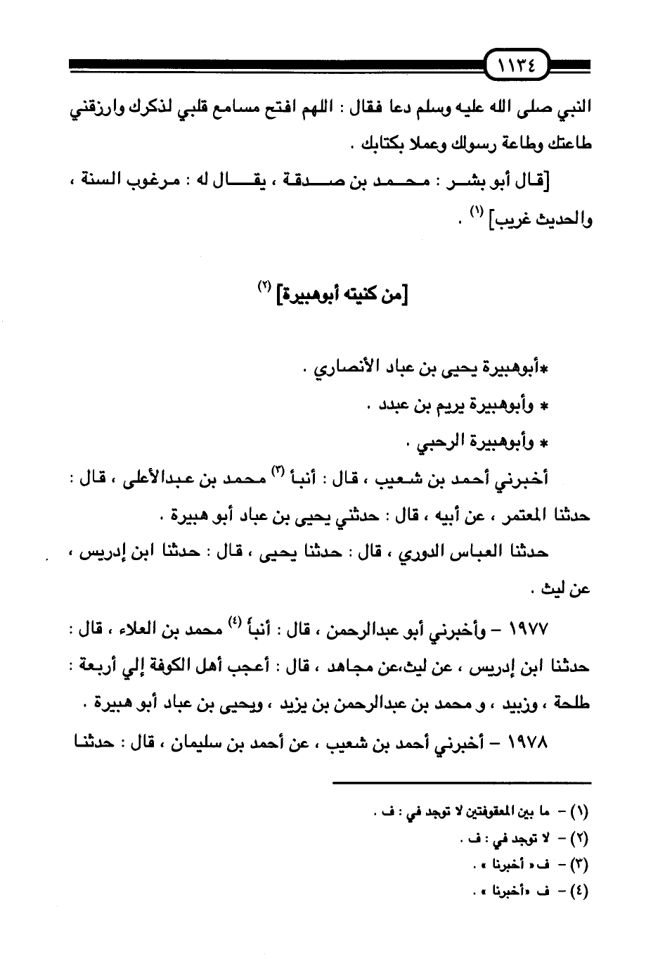§مَنْ كُنْيَتُهُ أَبُو هُبَيْرَةَ أَبُو هُبَيْرَةَ يَحْيَى بْنُ عَبَّادٍ الْأَنْصَارِيُّ. وَأَبُو هُبَيْرَةَ يَرِيمُ بْنُ عَبْدَدَ. وأَبُوهبيرةَ الرَّحَبِيُّ أَخْبَرَنِي أَحْمَدُ بْنُ شُعَيْبٍ قَالَ: أَنْبَأَ مُحَمَّدُ بْنُ عَبْدِ الْأَعْلَى قَالَ: حَدَّثَنَا الْمُعْتَمِرُ، عَنْ أَبِيهِ قَالَ: حَدَّثَنِي يَحْيَى بْنُ عَبَّادٍ أَبُو هُبَيْرَةَ. حَدَّثَنَا الْعَبَّاسُ الدُّورِيُّ قَالَ: حَدَّثَنَا يَحْيَى قَالَ: حَدَّثَنَا ابْنُ إِدْرِيسَ عَنْ لَيْثٍ