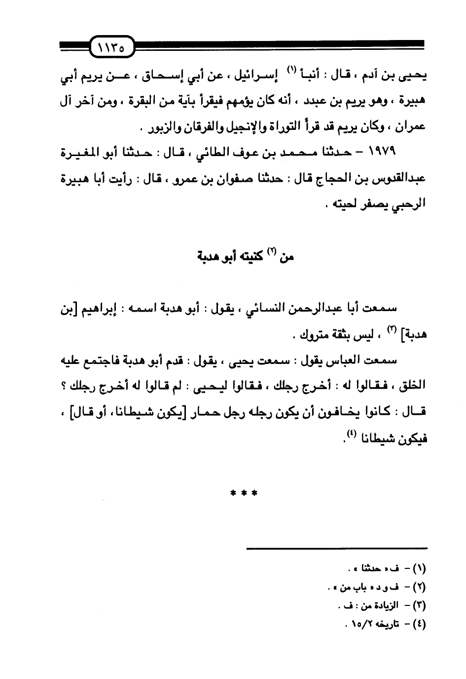 §مَنْ كُنْيَتُهُ أَبُو هُدْبَةَ سَمِعْتُ أَبَا عَبْدِ الرَّحْمَنِ النَّسَائِيَّ يَقُولُ: " أَبُو هُدْبَةَ اسْمُهُ: إِبْرَاهِيمُ بْنُ هُدْبَةَ، لَيْسَ بِثِقَةٍ مَتْرُوكٌ ". سَمِعْتُ الْعَبَّاسَ يَقُولُ: سَمِعْتُ يَحْيَى يَقُولُ: " قَدِمَ أَبُو هُدْبَةَ فَاجْتَمَعَ عَلَيْهِ الْخَلْقُ، فَقَالُوا لَهُ: أَخْرِجْ رِجْلَكَ "، فَقَالُوا لِيَحْيَى: لِمَ قَالُوا لَهُ أَخْرِجْ رِجْلَكَ؟ قَالَ: «كَانُوا يَخَافُونَ أَنْ يَكُونَ رِجْلُهُ رِجْلَ حِمَارٍ يَكُونُ شَيْطَانًا، أَوْ قَالَ، فَيَكُونُ شَيْطَانًا»