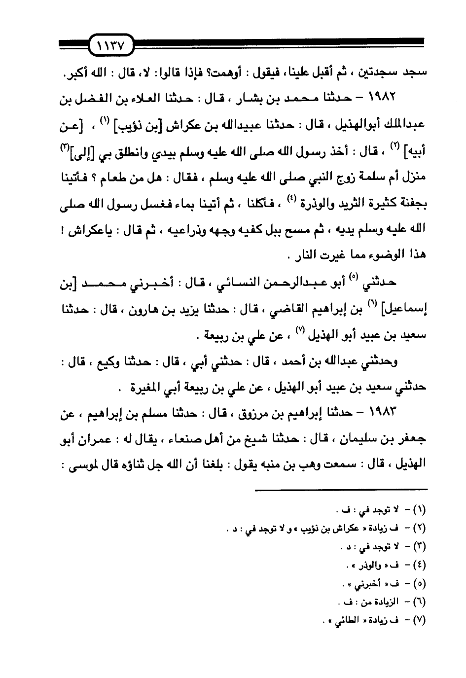 1982 - حَدَّثَنَا مُحَمَّدُ بْنُ بَشَّارٍ، قَالَ: حَدَّثَنَا الْعَلَاءُ بْنُ الْفَضْلِ بْنِ عَبْدِ الْمَلِكِ أَبُو الْهُذَيْلِ، قَالَ: حَدَّثَنَا عُبَيْدُ اللَّهِ بْنُ عِكْرَاشِ بْنِ ذُؤَيْبٍ، عَنْ أَبِيهِ قَالَ: أَخَذَ رَسُولُ اللَّهِ صَلَّى اللهُ عَلَيْهِ وَسَلَّمَ بِيَدِي وَانْطَلَقَ بِي إِلَى مَنْزِلِ أُمِّ سَلَمَةَ زَوْجِ النَّبِيِّ صَلَّى اللهُ عَلَيْهِ وَسَلَّمَ فَقَالَ: «هَلْ مِنْ طَعَامٍ؟» فَأُتِينَا بِجَفْنَةٍ كَثِيرَةِ الثَّرِيدِ وَالْوَذَرَةِ فَأَكَلْنَا ثُمَّ أُتِينَا بِمَاءٍ §فَغَسَلَ رَسُولُ اللَّهِ صَلَّى اللهُ عَلَيْهِ وَسَلَّمَ يَدَيْهِ ثُمَّ مَسَحَ بِبَلِّ كَفَّيْهِ وَجْهَهُ وَذِرَاعَيْهِ ثُمَّ قَالَ: «يَا عِكْرَاشُ هَذَا الْوُضُوءُ مِمَّا غَيَّرَتِ النَّارُ» حَدَّثَنِي أَبُو عَبْدِ الرَّحْمَنِ النَّسَائِيُّ قَالَ: أَخْبَرَنِي مُحَمَّدُ بْنُ إِسْمَاعِيلَ بْنِ إِبْرَاهِيمَ القَاضِي قَالَ: حَدَّثَنَا يَزِيدُ بْنُ هَارُونَ قَالَ: حَدَّثَنَا سَعِيدُ بْنُ عُبَيْدٍ أَبُو الْهُذَيْلِ، عَنْ عَلِيِّ بْنِ رَبِيعَةَ. وَحَدَّثَنِي عَبْدُ اللَّهِ بْنُ أَحْمَدَ، قَالَ: حَدَّثَنِي أَبِي قَالَ: حَدَّثَنَا وَكِيعٌ قَالَ: حَدَّثَنِي سَعِيدُ بْنُ عُبَيْدٍ أَبُو الْهُذَيْلِ، عَنْ عَلِيِّ بْنِ رَبِيعَةَ أَبِي الْمُغِيرَةِ