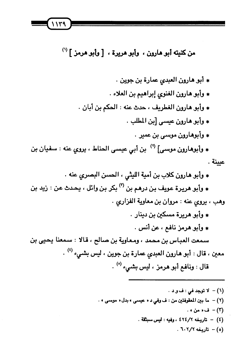 §مَنْ كُنْيَتُهُ أَبُو هَارُونَ، وَأَبُو هُرَيْرَةَ، وَأَبُو هُرْمُزَ أَبُو هَارُونَ الْعَبْدِيُّ عُمَارَةُ بْنُ جُوَيْنٍ. وَأَبُو هَارُونَ الْغَنَوِيُ إِبْرَاهِيمُ بْنُ الْعَلَاءِ. وَأَبُو هَارُونَ الْغَطْرِيفُ، حَدَّثَ عَنْهُ: الْحَكَمُ بْنُ أَبَانَ. وَأَبُو هَارُونَ عِيسَى بْنُ الْمُطَّلِبِ. وَأَبُو هَارُونَ مُوسَى بْنُ عُمَيْرٍ. وَأَبُو هَارُونَ مُوسَى بْنُ أَبِي عِيسَى الْحَنَّاطُ، يَرْوِي عَنْهُ: سَفْيَانُ بْنُ عُيَيْنَةَ. وَأَبُو هَارُونَ كِلَابُ بْنُ أُمَيَّةَ اللَّيْثِيُّ، الْحَسَنُ الْبَصْرِيُّ عَنْهُ وَأَبُو هُرَيْرَةَ عُوَيْفُ بْنُ دِرْهَمِ بْنِ بَكْرِ بْنِ وَائِلٍ، يُحَدِّثُ عَنْ: زَيْدِ بْنِ وَهْبٍ، يَرْوِي عَنْهُ: مَرْوَانُ بْنُ مُعَاوِيَةَ الْفَزَارِيُّ. وَأَبُو هُرَيْرَةَ مِسْكِينُ بْنُ دِينارٍ. وَأَبُو هُرْمُزَ نَافِعٌ، عَنْ أَنَسٍ سَمِعْتُ الْعَبَّاسَ بْنَ مُحَمَّدٍ، وَمُعَاوِيَةَ بْنَ صَالِحٍ، قَالَا: سَمِعْنَا يَحْيَى بْنَ مَعِينٍ قَالَ: «أَبُو هَارُونَ الْعَبْدِيُّ عُمَارَةُ بْنُ جُوَيْنٍ لَيْسَ بِشَيْءٍِ» . قَالَ: وَنَافِعٌ أَبُو هُرْمُزَ، لَيْسَ بِشَيْءٍ
