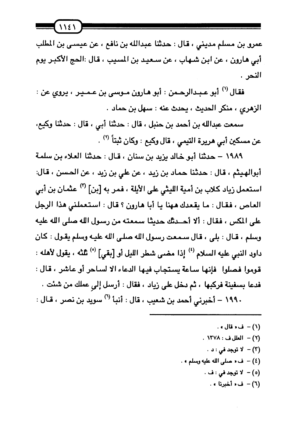 1989 - حَدَّثَنَا أَبُو خَالِدٍ يَزِيدُ بْنُ سِنَانٍ قَالَ: حَدَّثَنَا الْعَلَاءُ بْنُ سَلَمَةَ أَبُو الْهَيْثَمِ، قَالَ: حَدَّثَنَا حَمَّادُ بْنُ زَيْدٍ، عَنْ عَلِيِّ بْنِ زَيْدٍ، عَنِ الْحَسَنِ قَالَ: اسْتَعْمَلَ زِيَادٌ كِلَابَ بْنَ أُمَيَّةَ اللَّيْثِيَّ عَلَى الْأَيْلَةِ فَمَرَّ بِهِ عُثْمَانُ بْنُ أَبِي الْعَاصِ فَقَالَ: مَا يُقْعِدُكَ هَاهُنَا يَا أَبَا هَارُونَ؟ قَالَ: اسْتَعْمَلَنِي هَذَا الرَّجُلُ عَلَى الْمَكْسِ فَقَالَ: أَلَا أُحَدِّثُكَ حَدِيثًا سَمِعْتُهُ مِنْ رَسُولِ اللَّهِ صَلَّى اللهُ عَلَيْهِ وَسَلَّمَ؟ قَالَ: بَلَى. قَالَ: سَمِعْتُ رَسُولَ اللَّهِ صَلَّى اللهُ عَلَيْهِ وَسَلَّمَ يَقُولُ: " §كَانَ دَاوُدُ النَّبِيُّ عَلَيْهِ السَّلَامُ إِذَا مَضَى شَطْرُ اللَّيْلِ أَوْ بَقِيَ ثُلُثُهُ يَقُولُ لِأَهْلِهِ: قُومُوا فَصَلُّوا فَإِنَّهَا سَاعَةٌ يُسْتَجَابُ فِيهَا الدُّعَاءُ إِلَّا لِسَاحِرٍ أَوْ عَاشِرٍ " قَالَ: فَدَعَا بِسَفِينَةٍ فَرَكِبَهَا ثُمَّ دَخَلَ عَلَى زِيَادٍ فَقَالَ: أَرْسِلْ إِلَى عَمَلِكَ مَنْ شِئْتَ